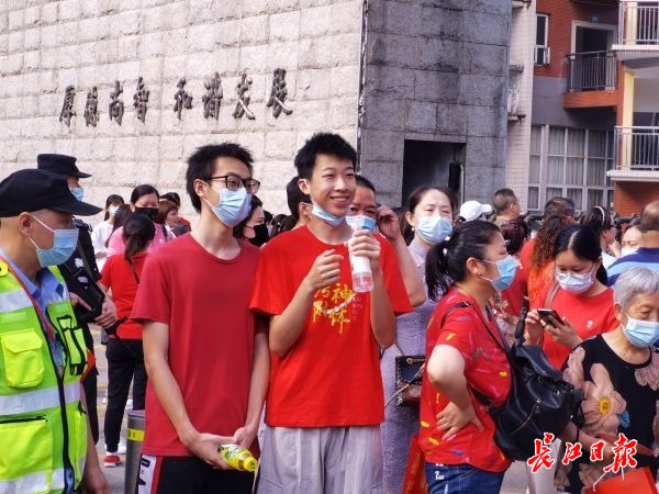 在武汉第一中学考点门前,一位穿着“考神附体”字样T恤的男生,在给同学加油。男生叫李文骢,是武汉外国语学校学生,已经被保送至上海财大。在他身旁的同学张敬知,也已被保送上海外国语大学。他们不用参加高考,特意换上红色T恤,来为同学们加油,希望给同学多一些鼓励和好运。