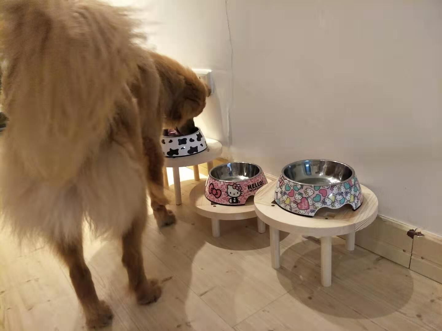 张莉家中养了三只小狗,伴随着狗狗一天天长大,她开始担心狗狗吃食物时低头,会患上颈椎病。于是,她特意定制三个小板凳,将碗放在板凳上,供狗狗吃食物时不再费力低头。