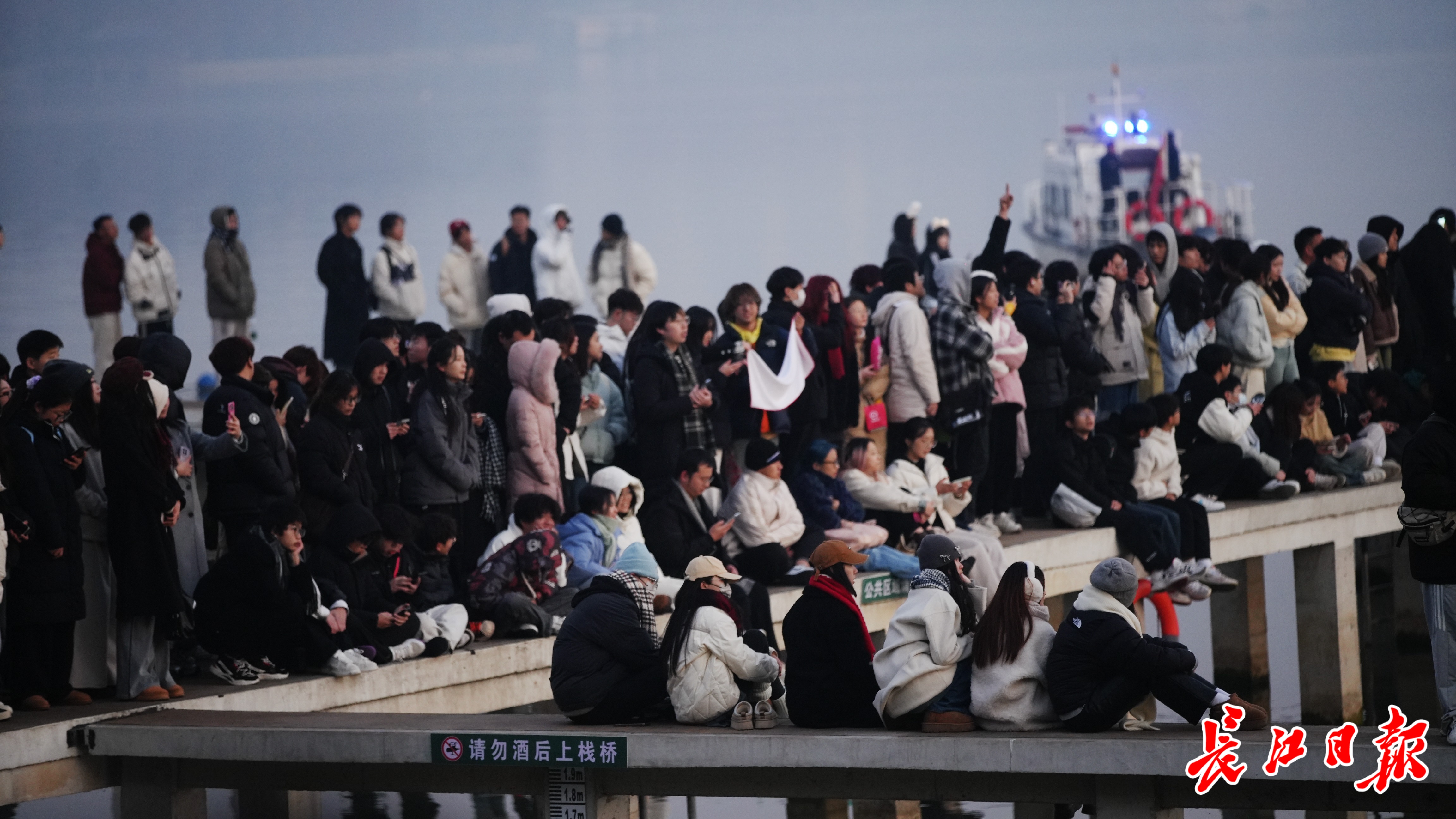 凌晨4时许,凌波门前已陆续有游客驻足等待,6时许,栈桥上、平台上已是摩肩接踵。长江日报记者现场看到,前来观看新年日出的,有的是武汉的大学生,有的是亲子家庭,还有的是来汉跨年游的游客。日出前,他们相互依偎着、问候着、期待着,眼神不约而同望向东方。