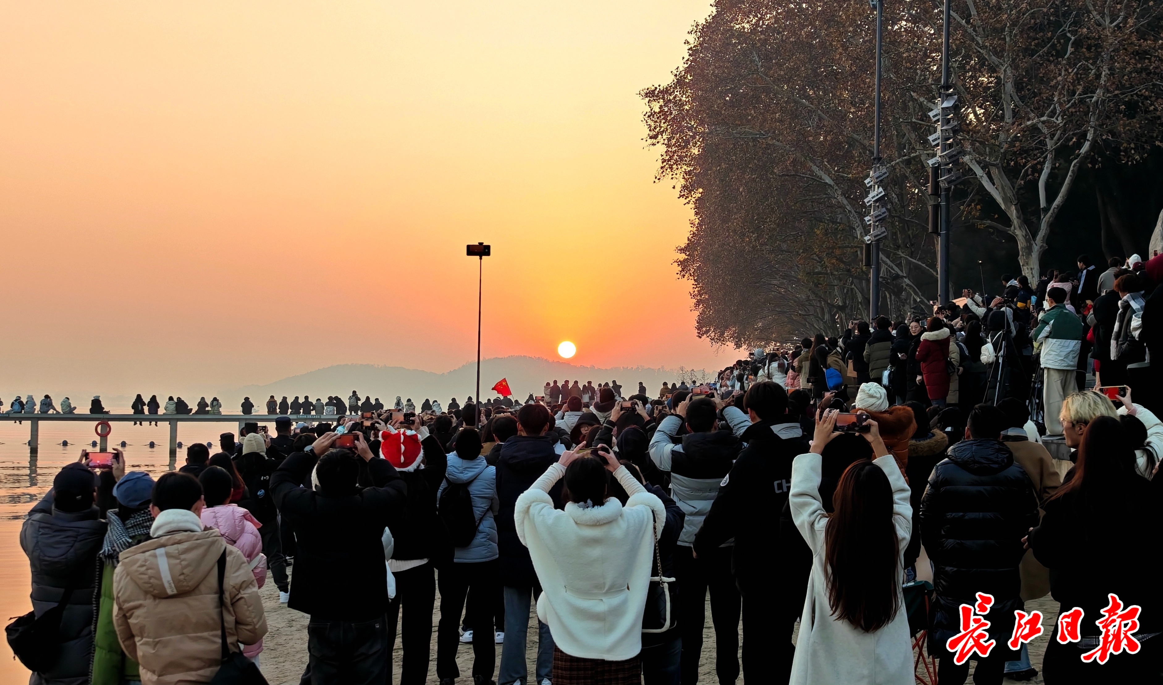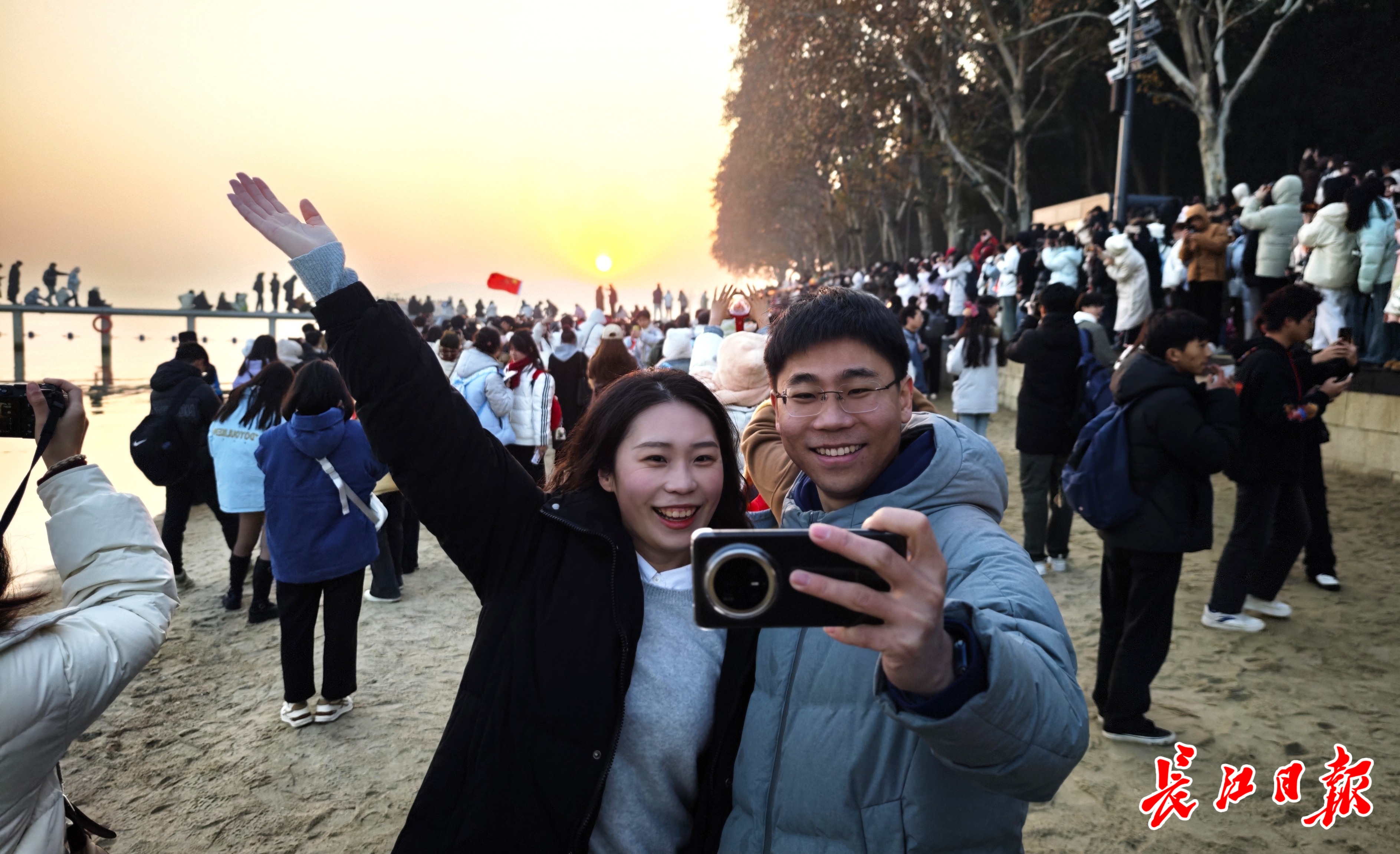 2025年1月1日清晨,大批游客在东湖凌波门迎接新年第一缕阳光。 长江日报记者何晓刚 摄
