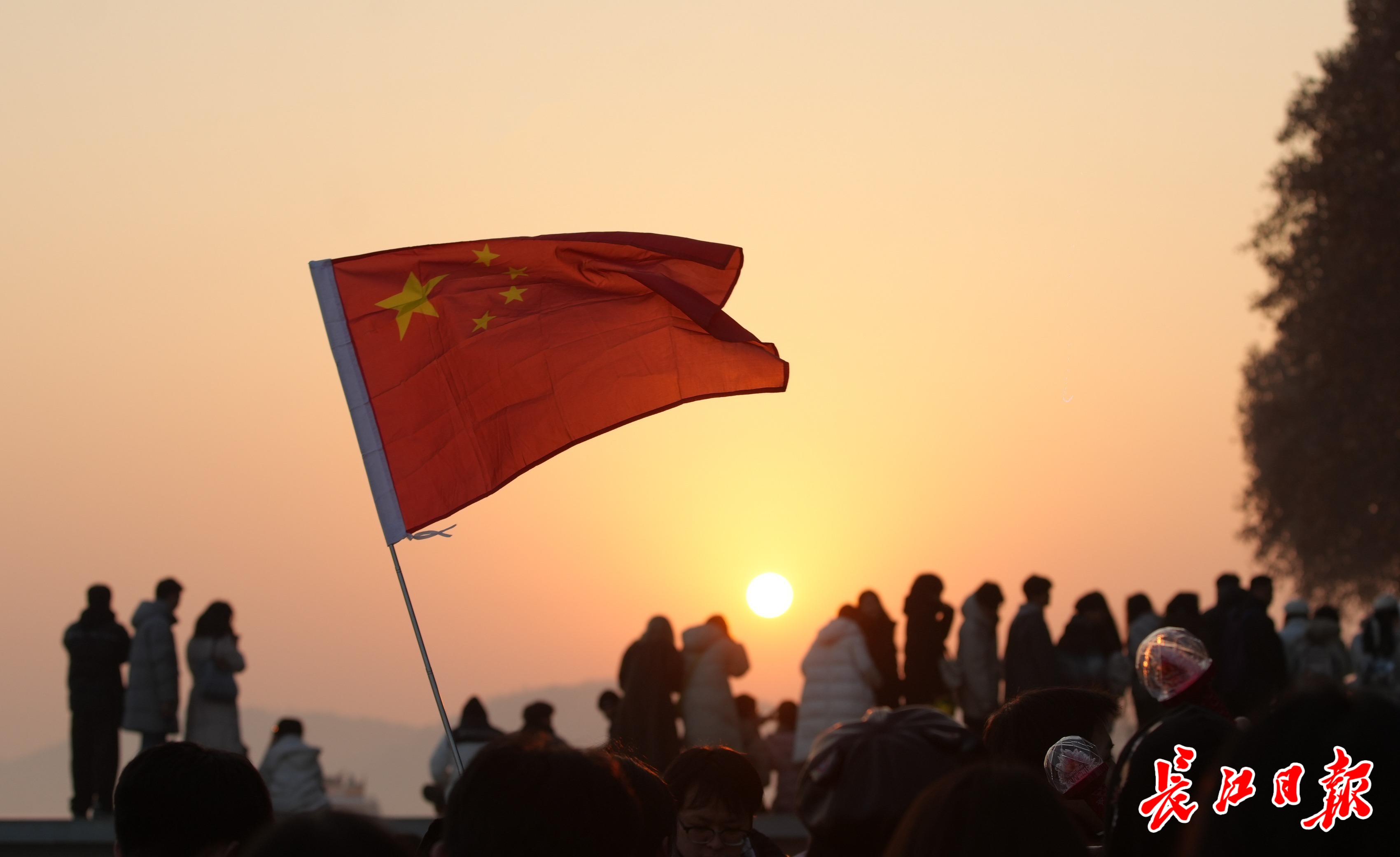 游客自带的五星红旗在朝阳下迎风招展。 长江日报记者何晓刚 摄