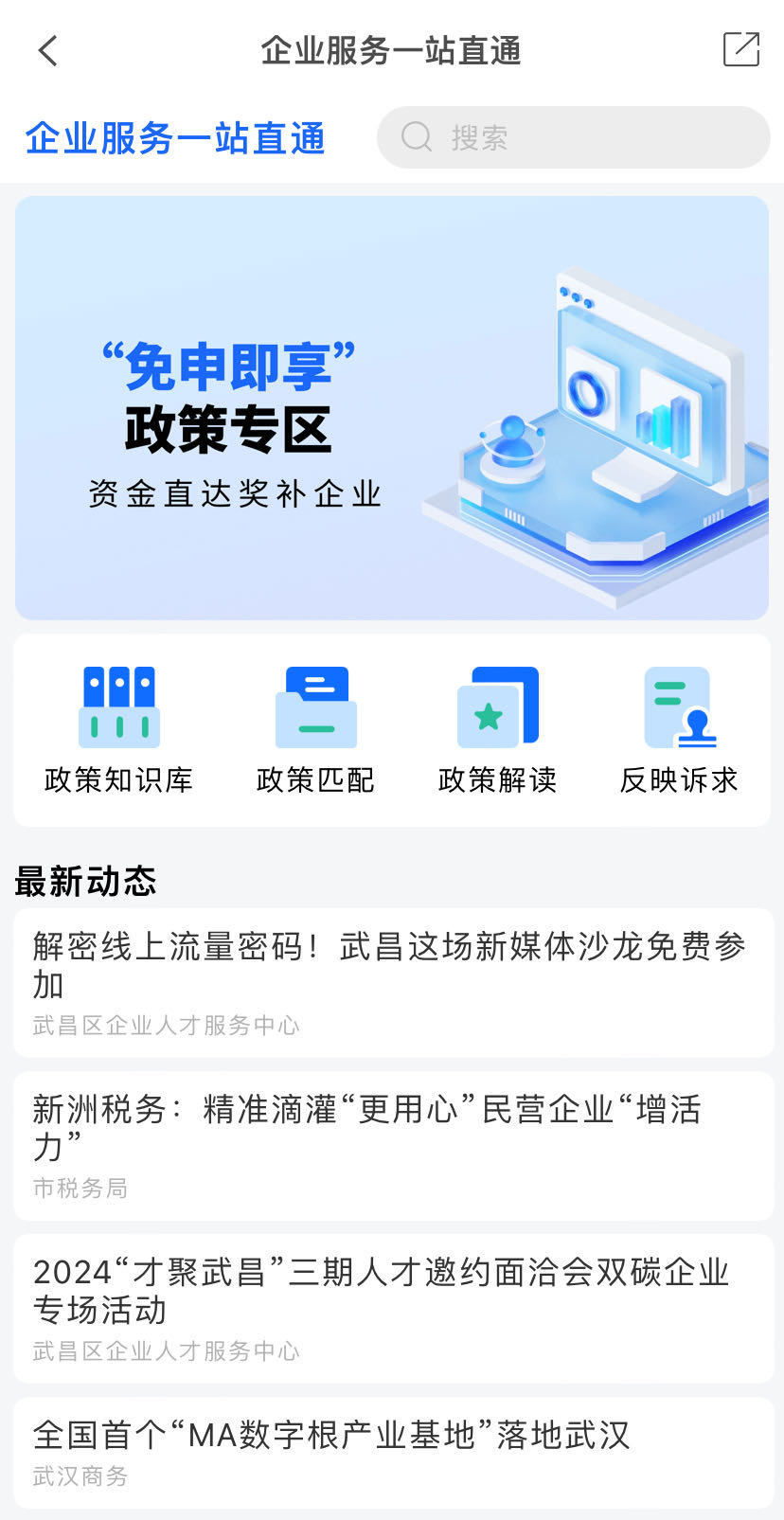 为给惠企政策提供更多的展示渠道,上周,长江日报携手武汉市数据局,在大武汉客户端“大武汉—城市服务”专区(点击进入)上线“企业服务一站直通”服务,为武汉市各企业、私营业主搭建起一座政企互动的桥梁。企业可一键进入,享受惠企政策精准推送及政策免申即享、即申即享、直达快享等助企纾困服务。