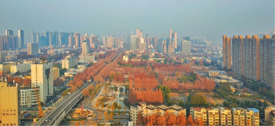 冬日的红杉树如同给大地涂上了胭脂。摄于青山区园林路。