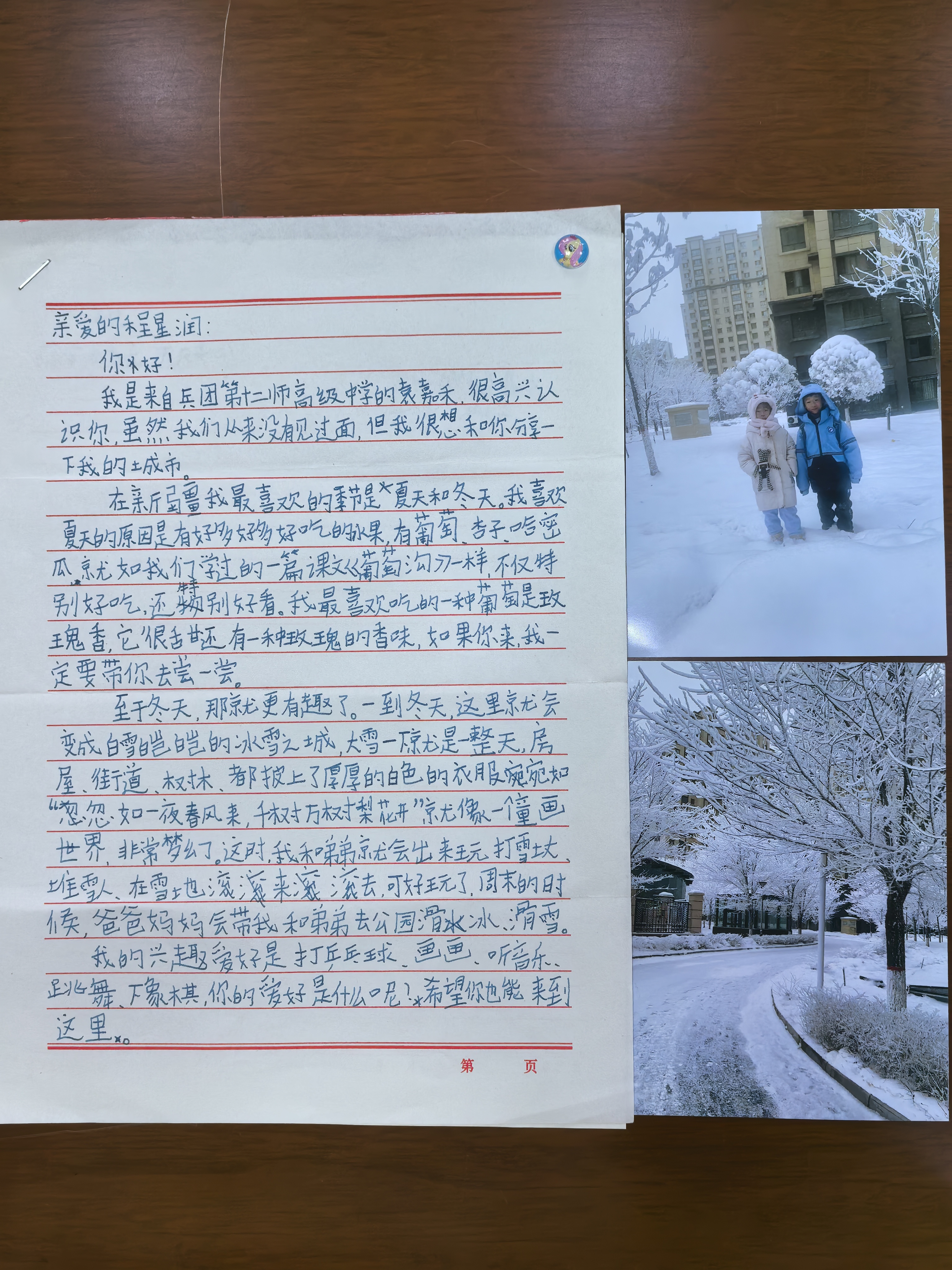 刘子沐的笔友叫李家乐,李家乐在信中介绍了新疆的四季,他写道:“春天万物复苏,还有一些没有融化的雪。夏天,人们急忙去买雪糕。秋天,我骑上心爱的自行车吹着凉风。冬天气温能到零下20摄氏度。”
