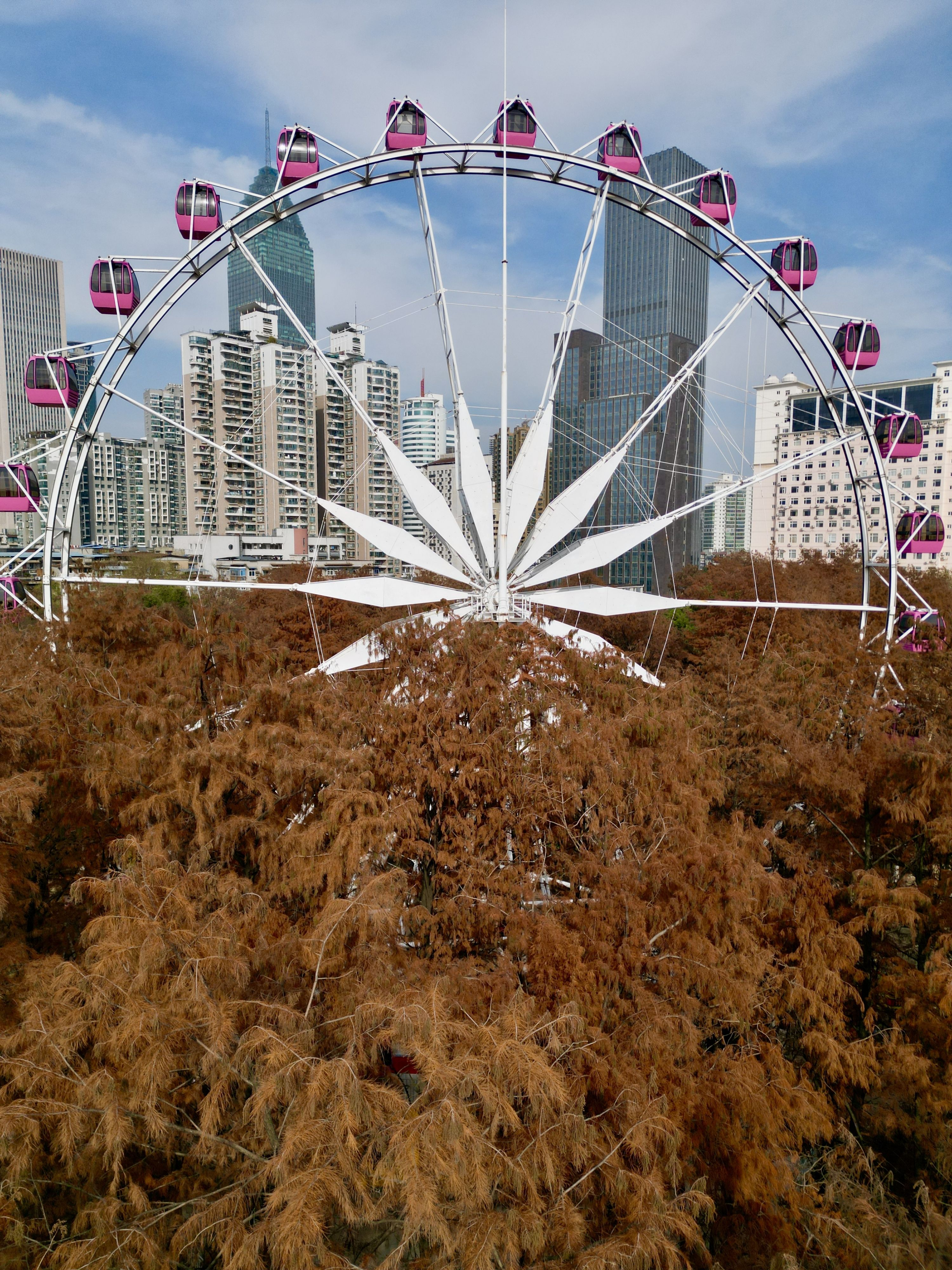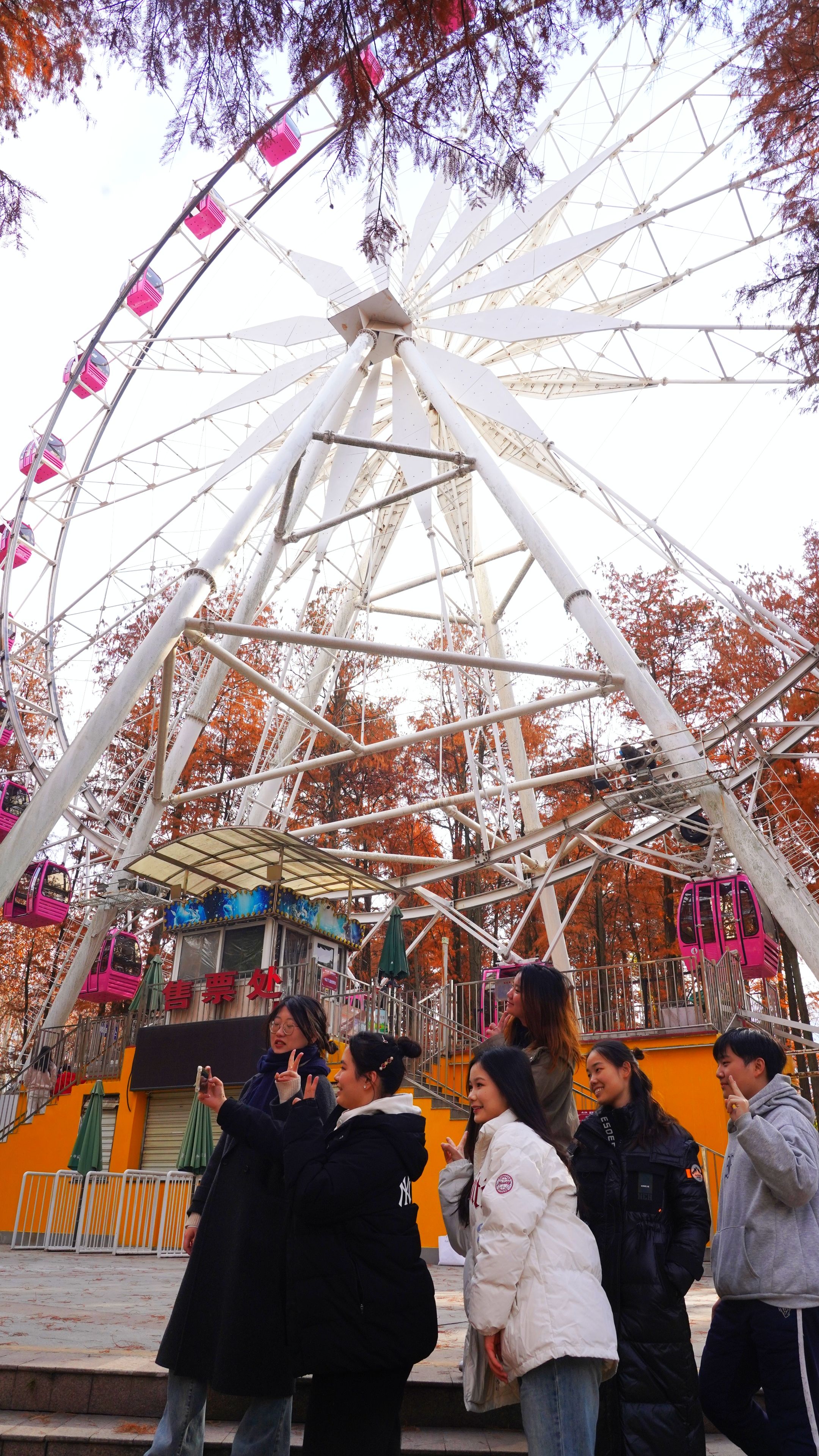 “簇拥摩天轮的水杉林在阳光映照下,光影交错,特别美!”一名在汉上学的大一新生赞叹道。她向大家推荐了一处打卡点,乘坐摩天轮到达中间处,将身后的水杉林作为背景板,拍照非常出片。水杉林下的开阔空地,更是绝佳打卡点,游客在此能与身后的摩天轮完美同框,定格美好瞬间。