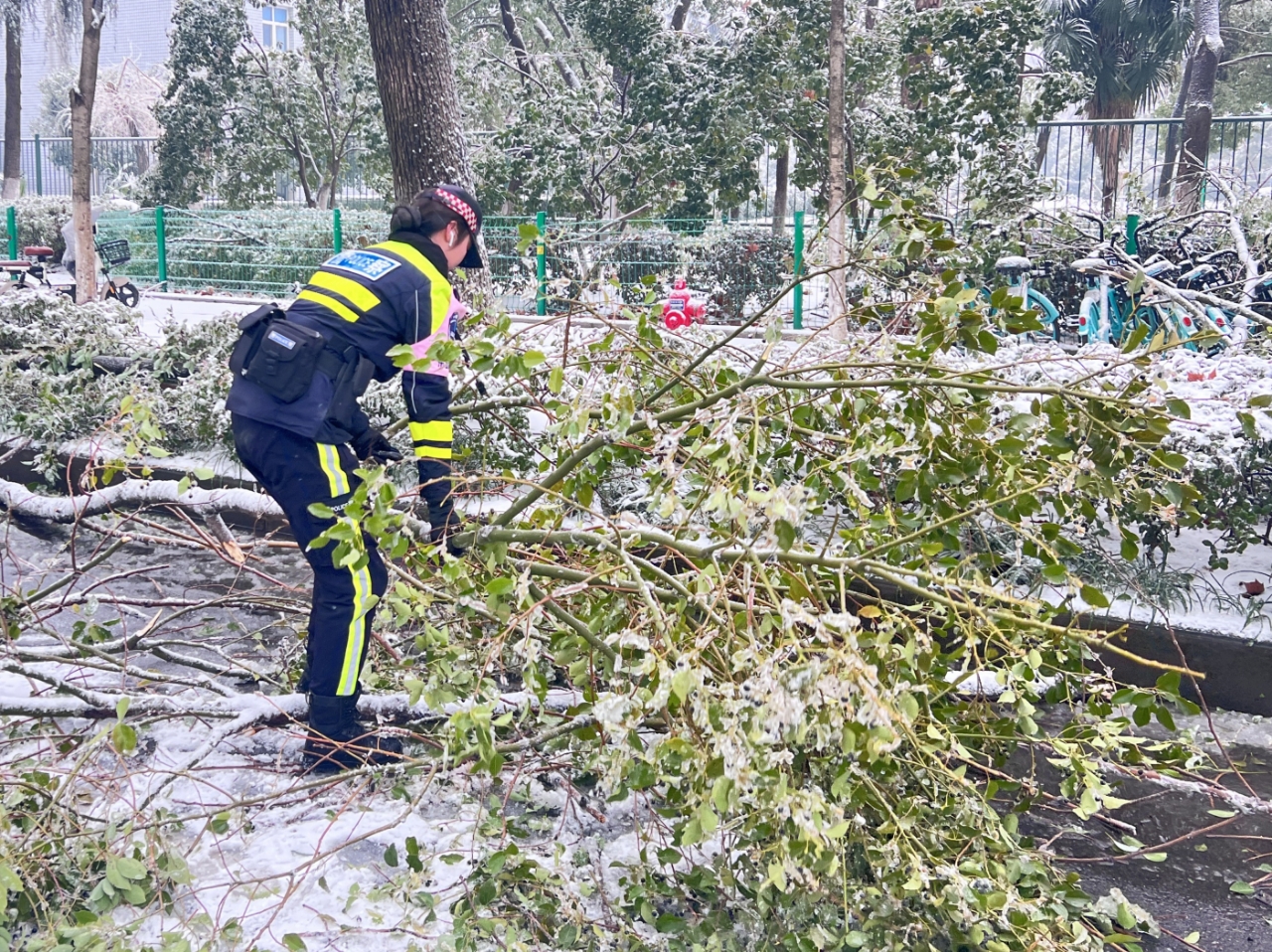 “辅警也是警察,女警也是警察,关键时刻必须上。”寒风刺骨,她和战友手持铁锹,铲起厚重的冰砖,搬开被冻雨压断的树木,保障道路的基本畅通。