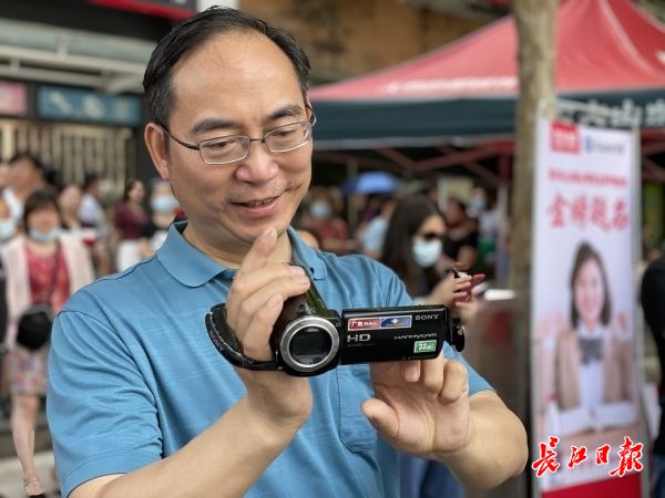 长江日报6月8日讯 6月8日8时许,武汉一中高考考点外,不少家长前来送考,其中一位父亲手持一台DV,格外专注地记录着儿子进入考场的身影。他是武汉外校考生冷舒煜的爸爸冷星火,他说要用视频记录孩子人生中每一个重要时刻。