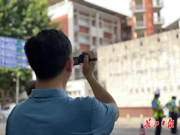 冷星火在武汉一中考点外,拍摄视频记录儿子高考点滴。(见习记者胡慧怡)