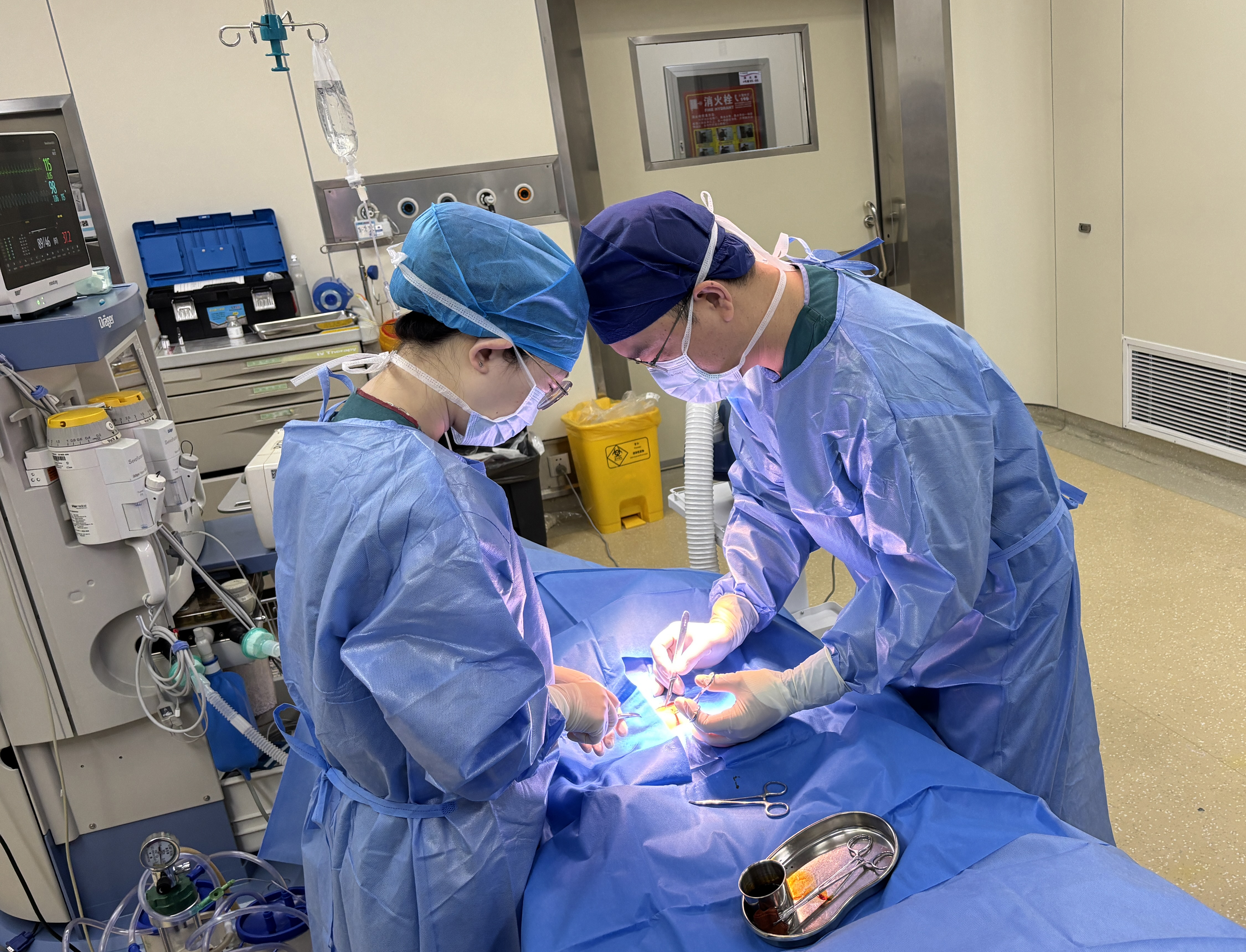 术中,外科刘俊医生探查发现小路左侧睾丸及附睾逆时针扭转720°,精索、睾丸及附睾呈暗紫色。医生为睾丸立即复位后,予以温盐水热敷30分钟,可见精索血运恢复,左侧睾丸及附睾血供部分改善,顺利保住其左侧睾丸。