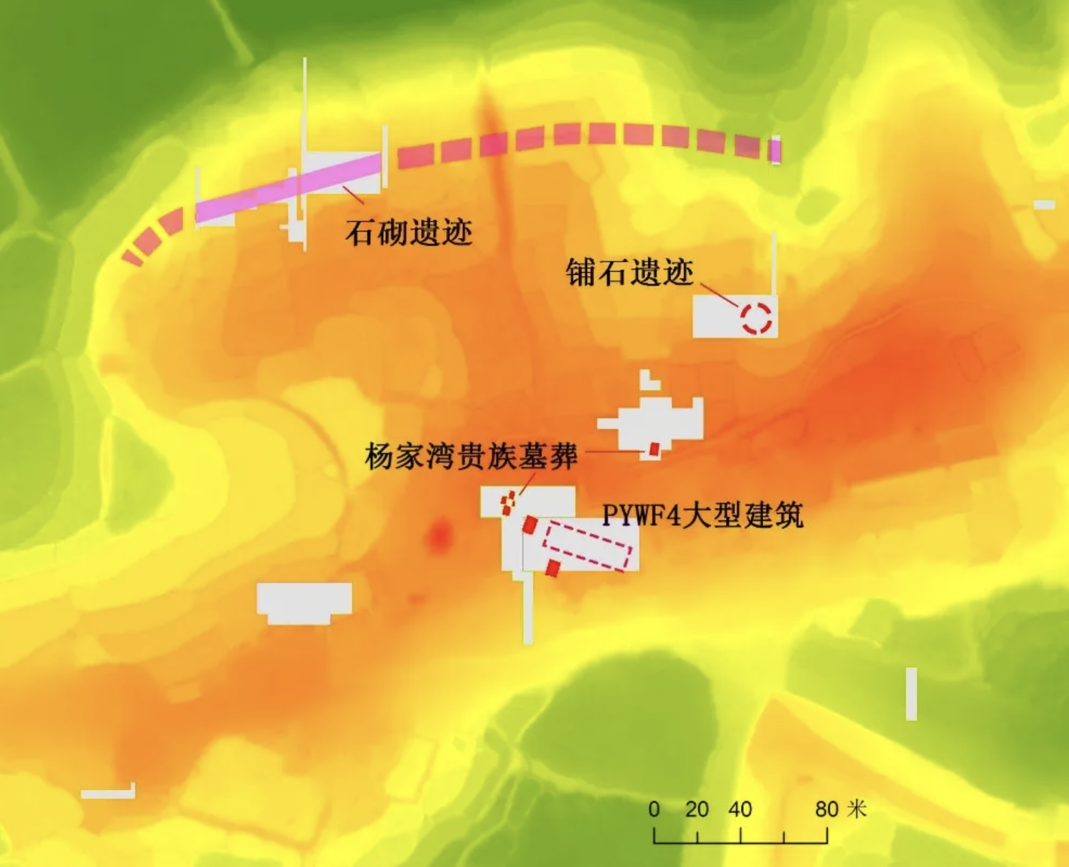 杨家湾南坡大型建筑、贵族墓葬与北坡石砌遗迹之间的位置分布。孙卓供图