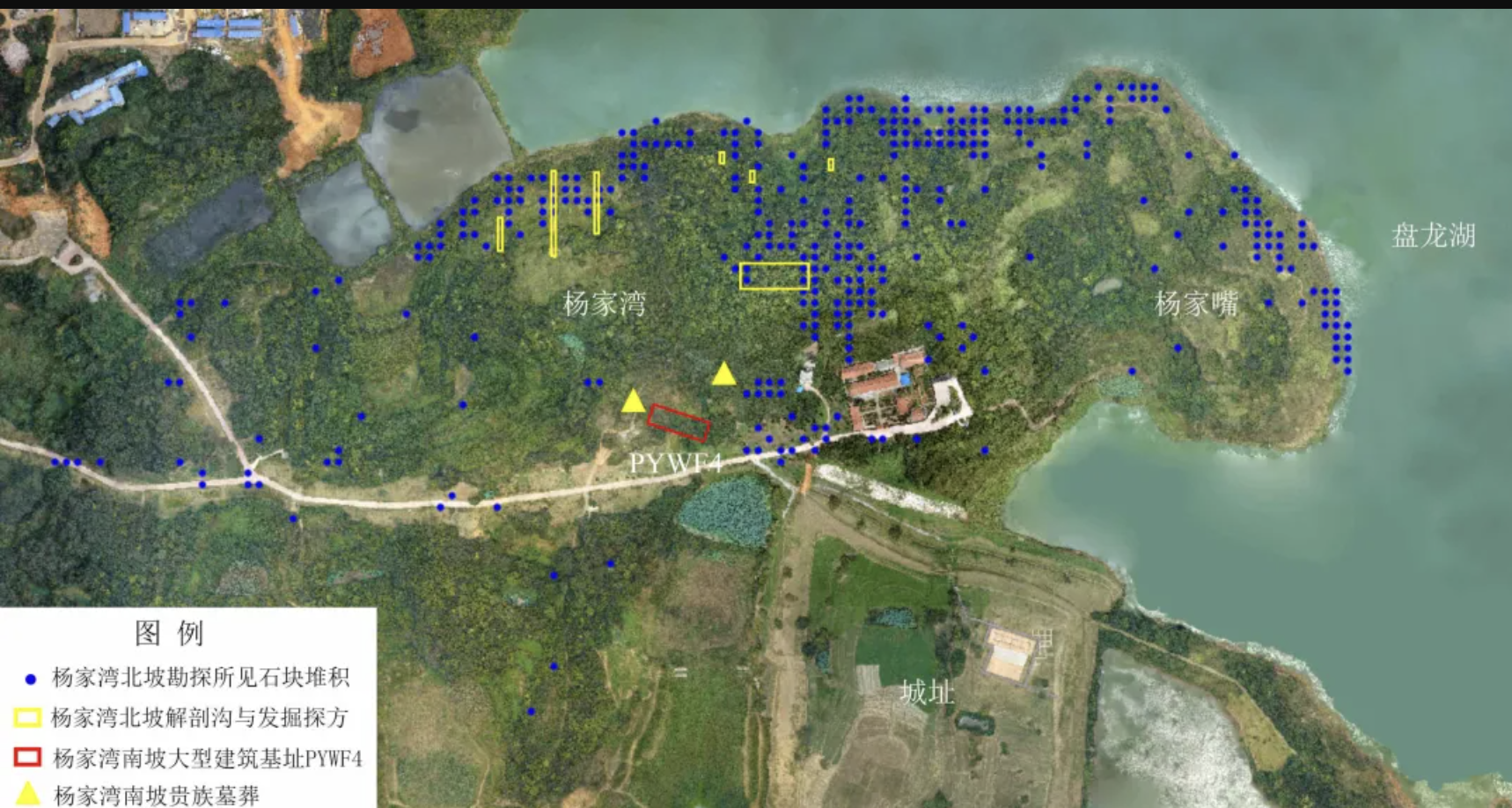 2023年至2024年初的工作中,杨家湾北坡首次揭露出走向和形状较为明确的大型条带状石砌遗迹,已揭露部分东西整体长约81米,最宽处约5米,方向为北偏西约20°。自2024年初至今,考古队进一步确认杨家湾北坡存在着大面积石头垒砌的人工遗迹,年代属于盘龙城城市聚落的最晚阶段。经过勘探石头堆积范围东西长约350米、南北最宽处约80米,展现为核心区北部边缘大型的石构工程建筑。