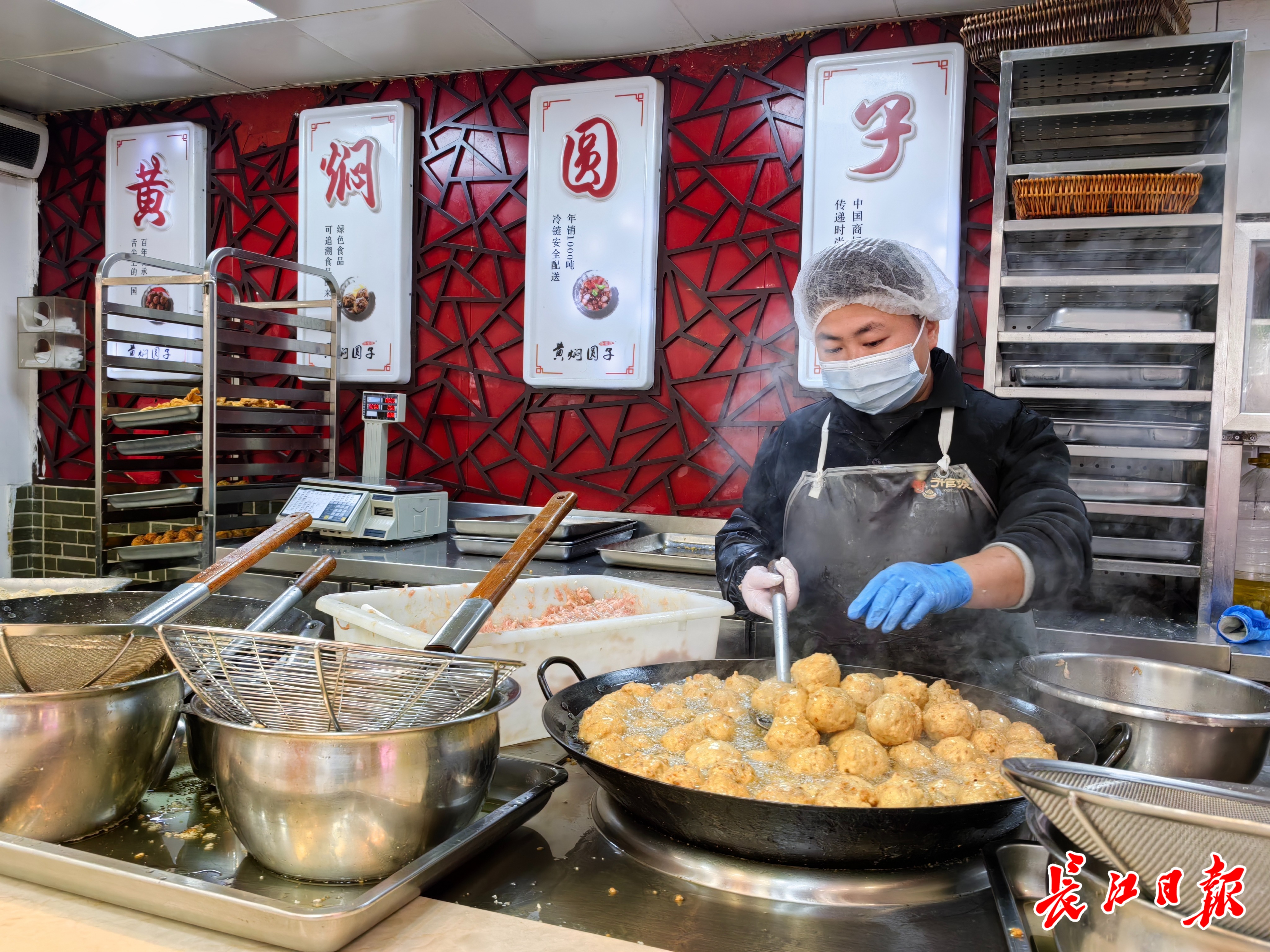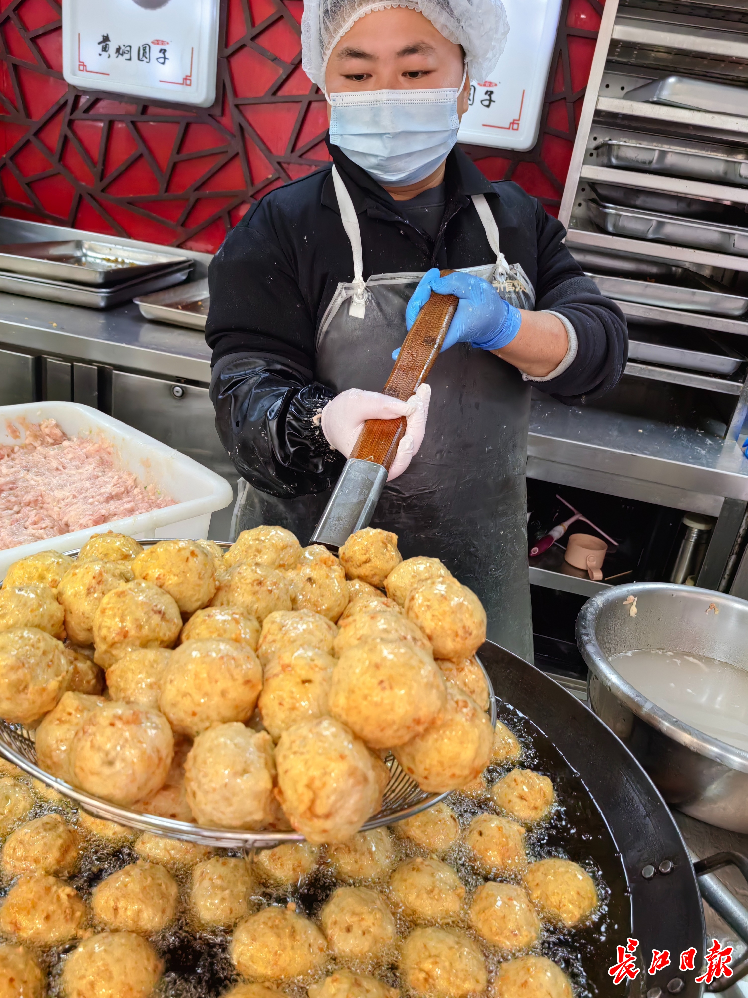 工作人员在炸制肉圆。长江日报记者金文兵 摄