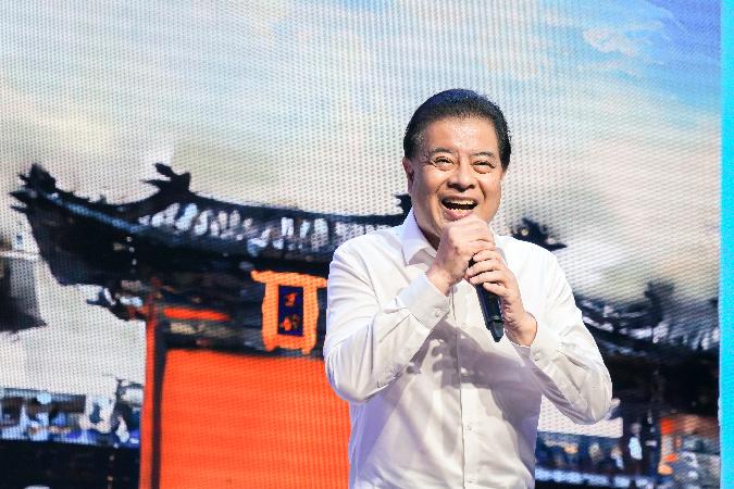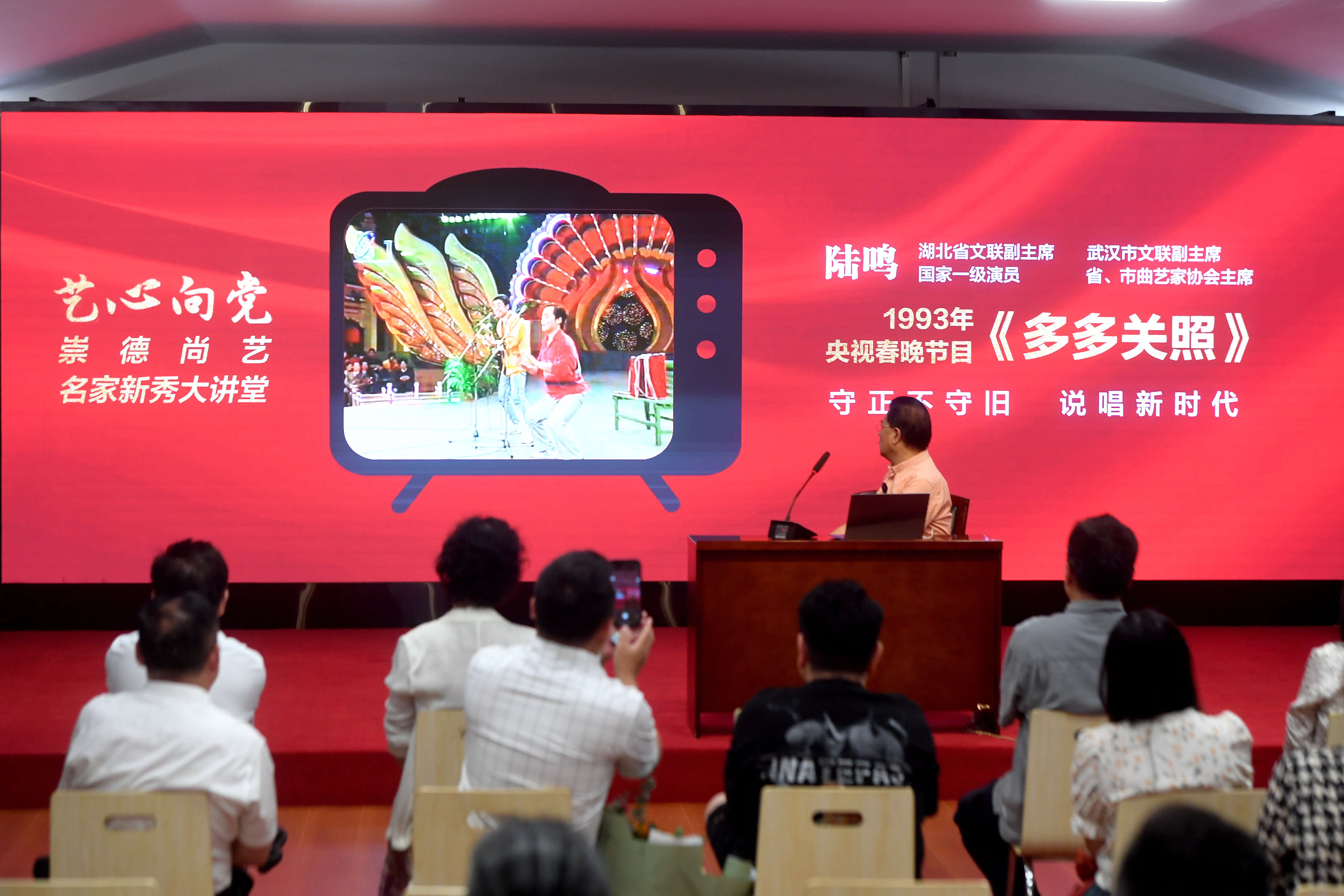在“艺心向党”崇德尚艺名家新秀大讲堂上,陆鸣现场讲述他参加1993年央视春晚节目《多多关照》的故事。资料图片