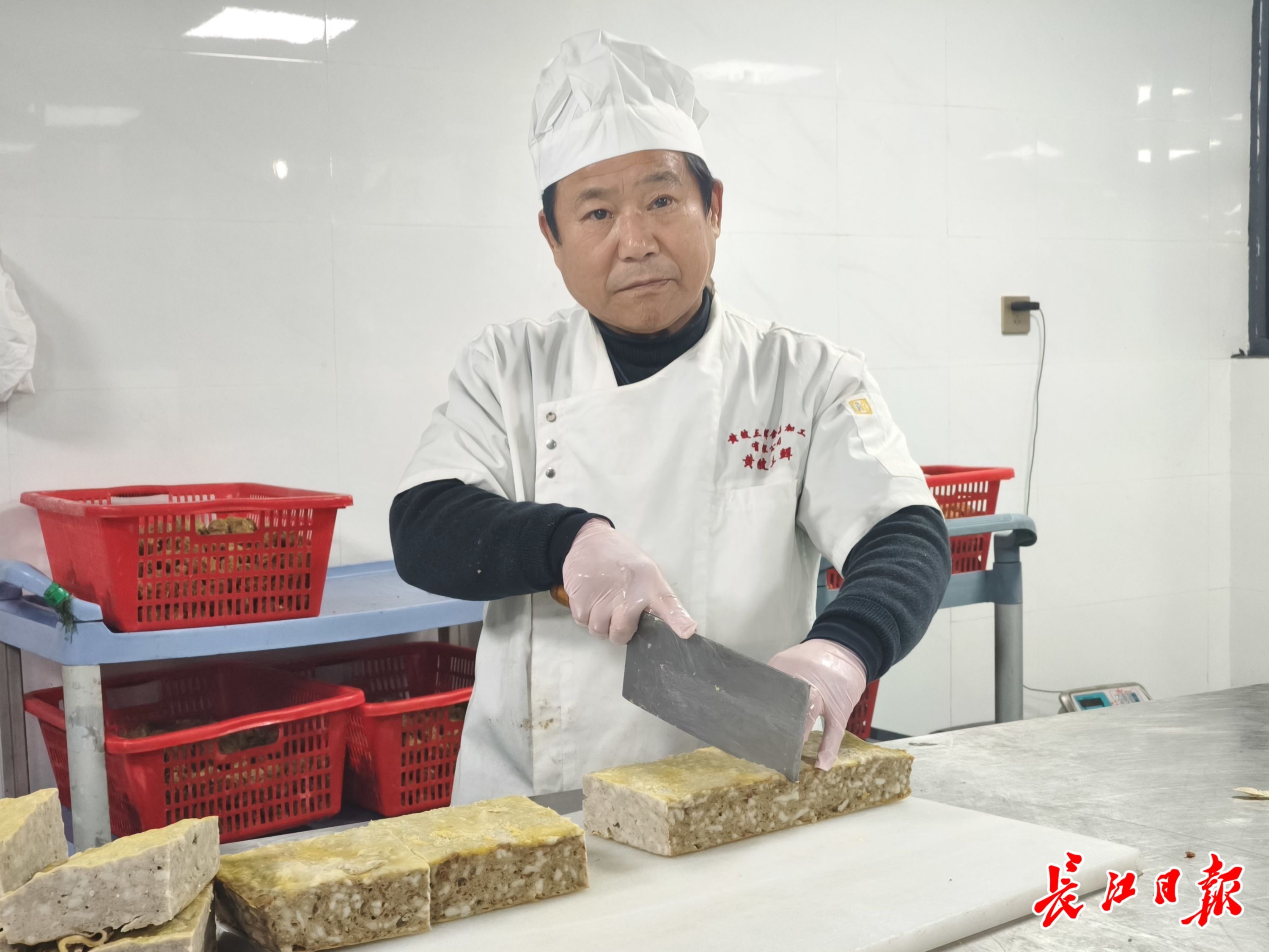 武汉市黄陂三鲜食品加工有限公司董事长季关运正在切肉糕。长江日报记者郝天娇 摄