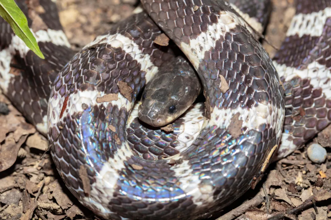 然而谈及蛇类,大多数人还是会色变,皆因毒蛇之威。李辰亮特别提醒,武汉地区的“毒蛇三巨头”不容小觑:舟山眼镜蛇,虽在新洲、江夏偶有踪迹,却似南国来客,或许因逃逸或放生而落户于此;银环蛇,身披黑白相间的华丽战袍,却隐藏着致命的毒性,令人闻风丧胆;短尾蝮,人称“百花七步倒”“土聋子”,更是武汉地区毒蛇伤人的“头号人物”。这蛇身体多为褐色、土黄色、黑色、灰色,喜欢栖息在坟地、树洞、鼠洞、干枯草丛等地,加上生性慵懒颜色和地面比较接近,不动时很难被察觉。