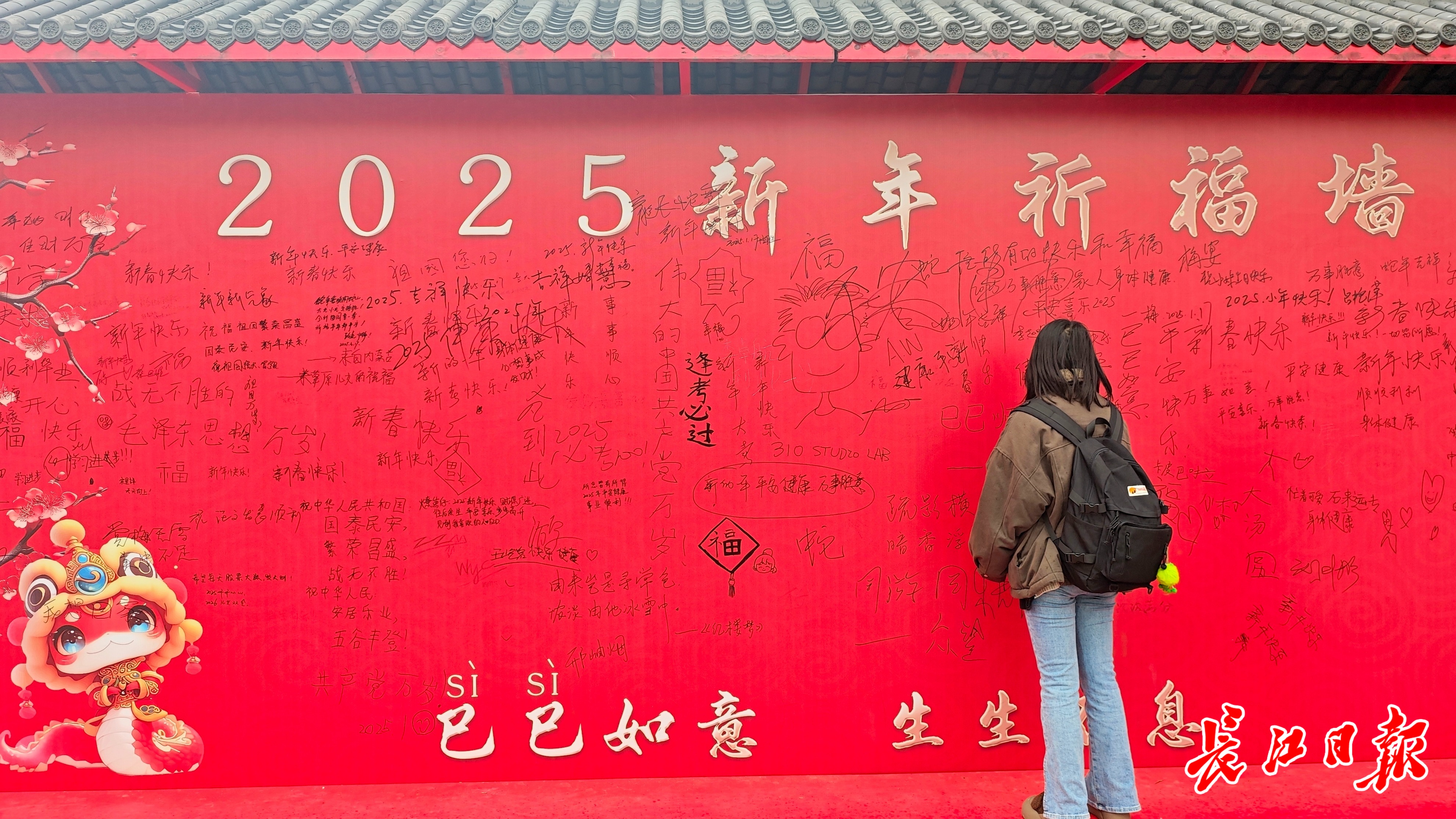 游客正在新年祈福墙上写下新年祝福。长江日报记者 何晓刚 摄