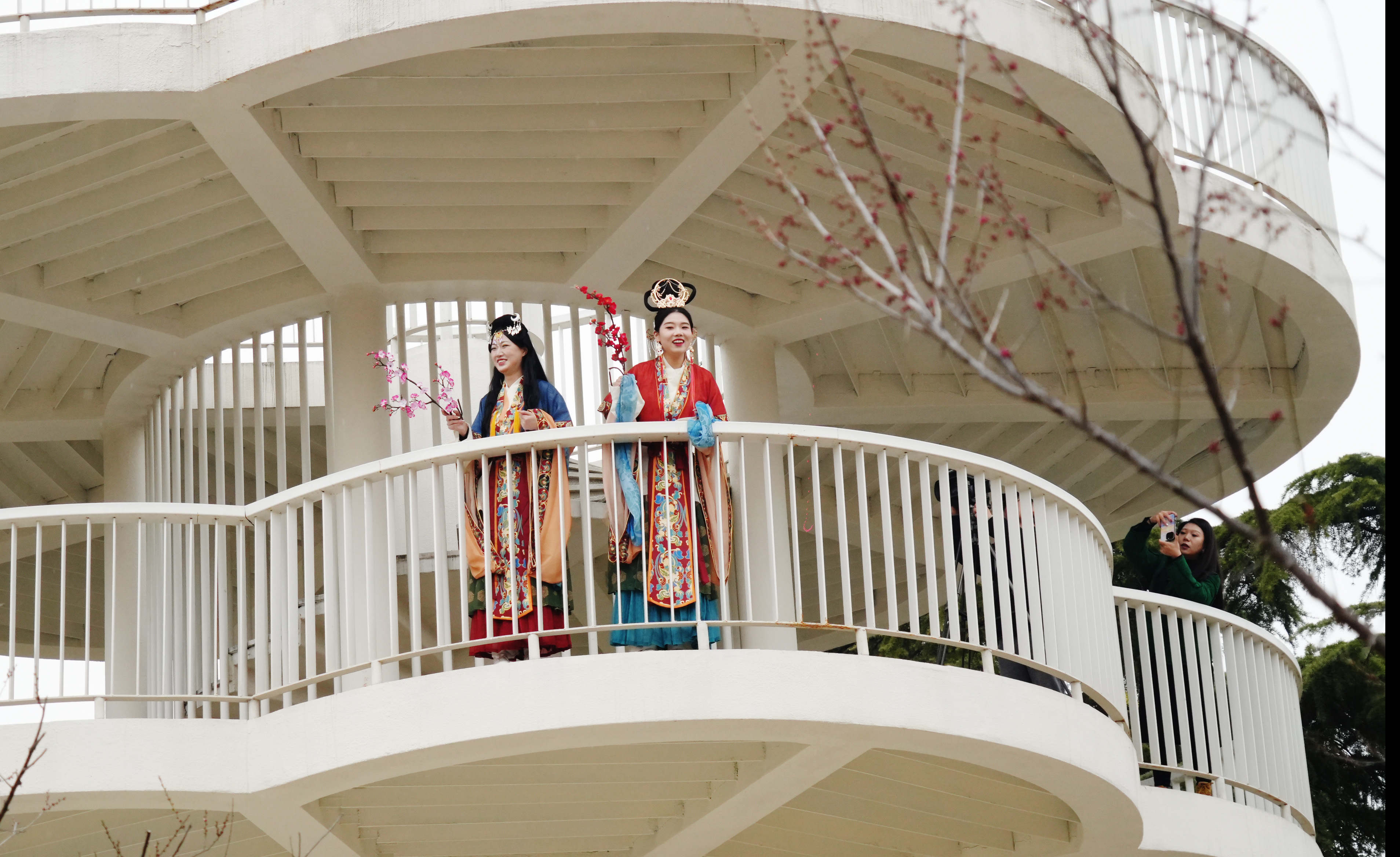 观梅台上,汉服女子正与游客进行互动。长江日报记者 何晓刚 摄