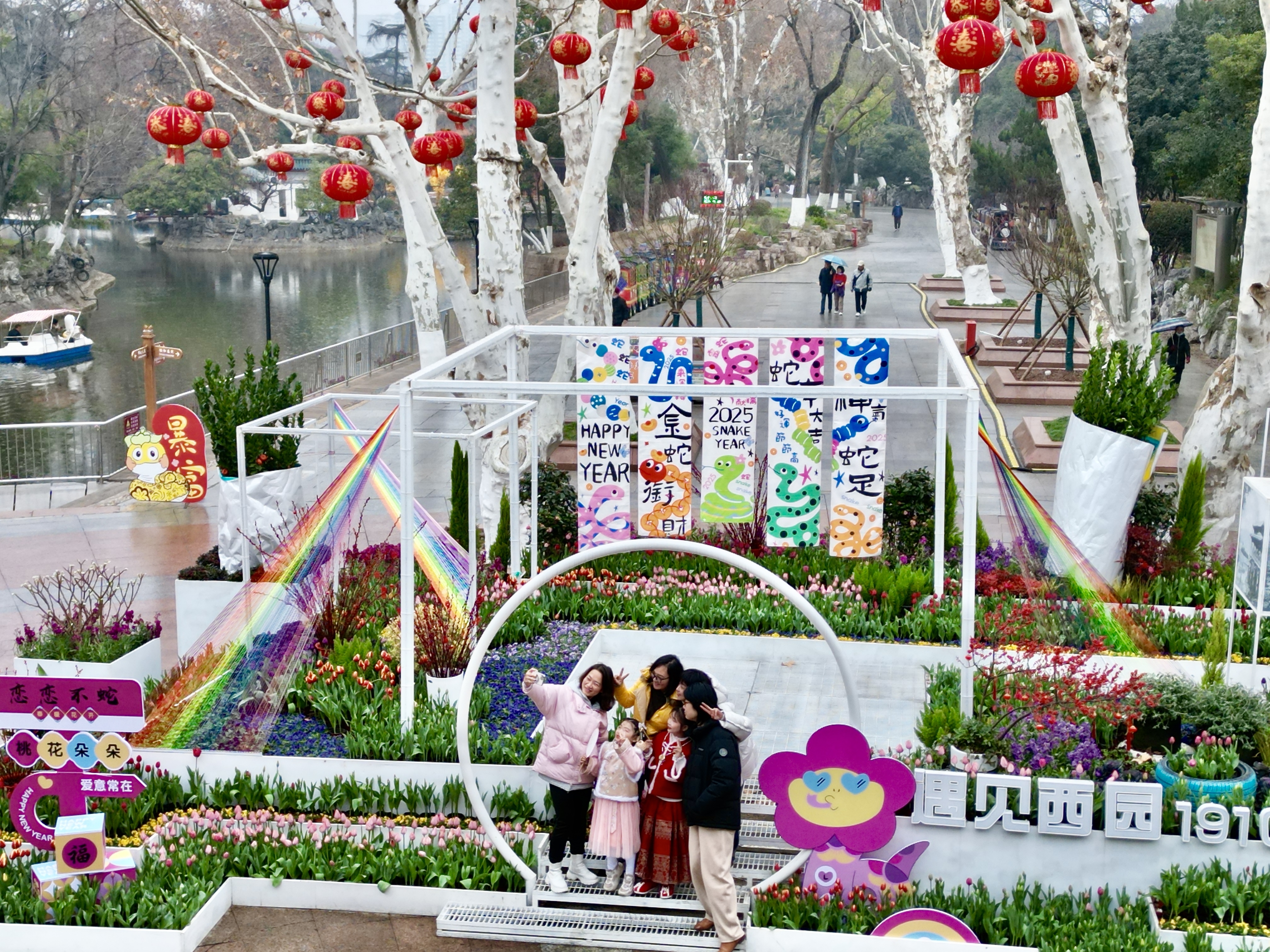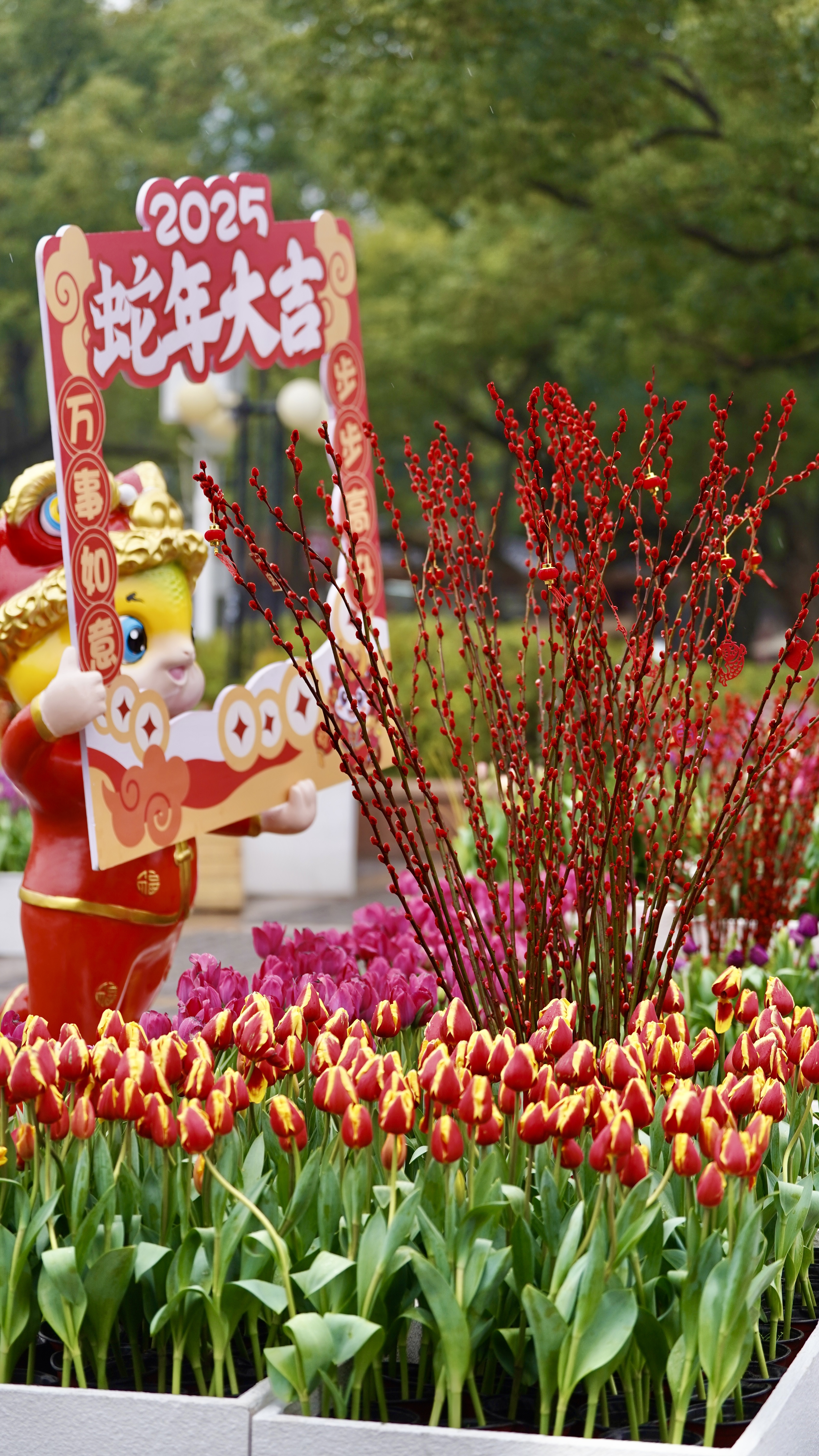 其他三个点位同样各具特色。“遇见西园”以郁金香为主,辅以红梅、茶梅等花卉,结合蛇年卡通造型装饰,寓意新年携手共进;“喷泉台阶”利用场地优势,布置春节打卡装置和时令花卉,搭配“传承年味,福纳百祥”小品,年味十足。在这里,游客还能欣赏到园艺师推荐的名为“人见人爱”的郁金香特色品种;“皇冠造型周边”则保留皇冠小品,增设许愿树装置,融合新春元素与吉祥植物,传递平安顺遂的美好祈愿。