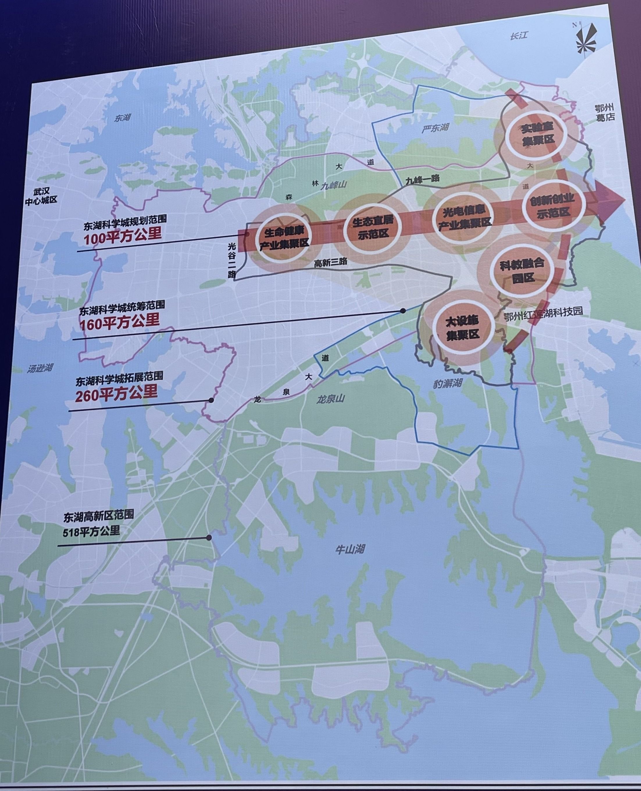 东湖科学城着力打造“一区三中心”,即创建东湖综合性国家科学中心核心承载区、全球光电信息科技创新中心、全球生命健康产业创新中心,以及全球碳中和工程科技创新中心,成为武汉创建“两个中心”、湖北建成科技强省以及我国建成世界主要科学中心的核心支撑力量。
