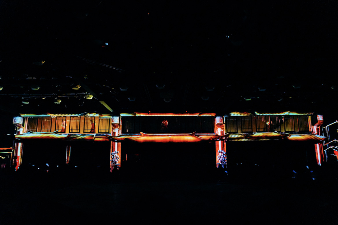 “在皎洁的月色下,花木兰决定替父从军;飘雪的寒夜里,木兰和战士们一起在战场上厮杀。”街区最重头的表演当属三楼的《楚地长歌》,十字形的舞台设计将观众席划分为四大区域,360度可旋转的观演座椅,让观众好似置身于一个万花筒般,前方是铁骨铮铮的战士,后方是光影变幻,以此展现《木兰传说》的英雄故事。