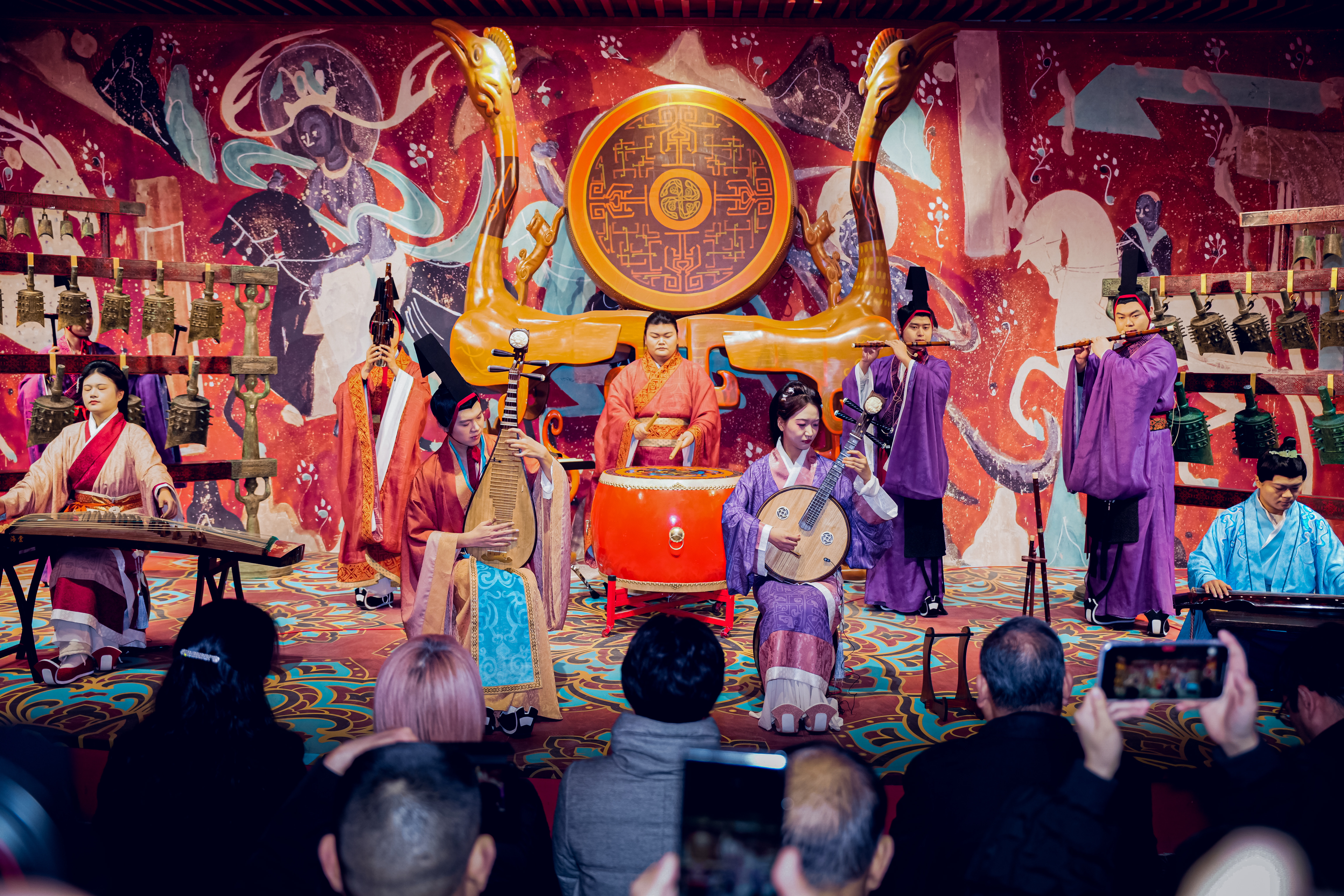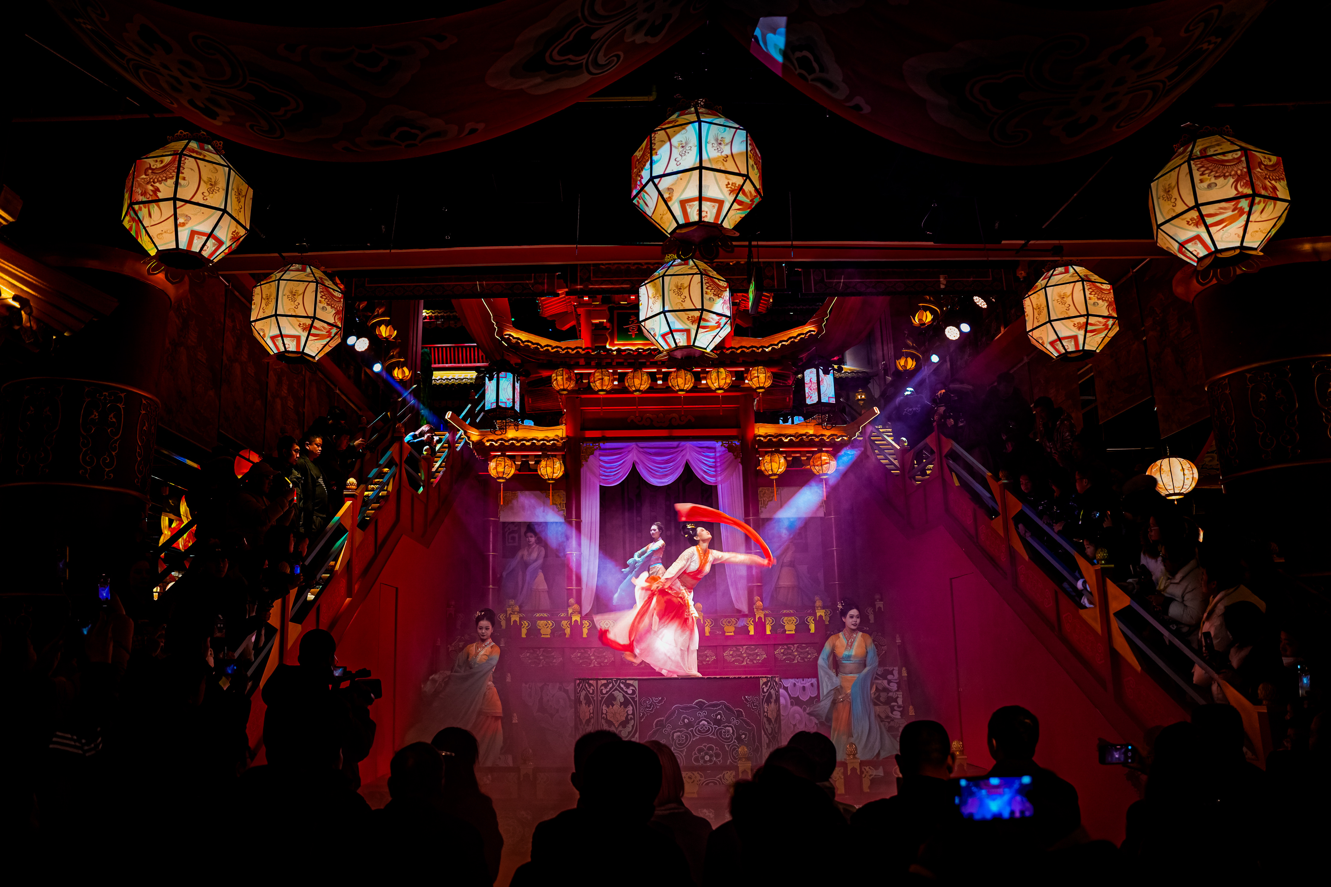 随着游玩的深入,室内烟波浩渺的水系设施成为一大看点,浣纱女在水中起舞,花魁“苏小小”在以五彩凤凰为底色的大琵琶前同游客热情互动,不远处还有“幻术”吸引游客围观。行至二楼,从建筑的雕梁画栋到陈设的精美考究,从《编钟楚乐》到《九歌山鬼》,行进式的演艺令人目不暇接。小朋友们在小吃街驻足,店主则忙不迭地准备着冰糖葫芦、红豆沙小丸子等小吃。