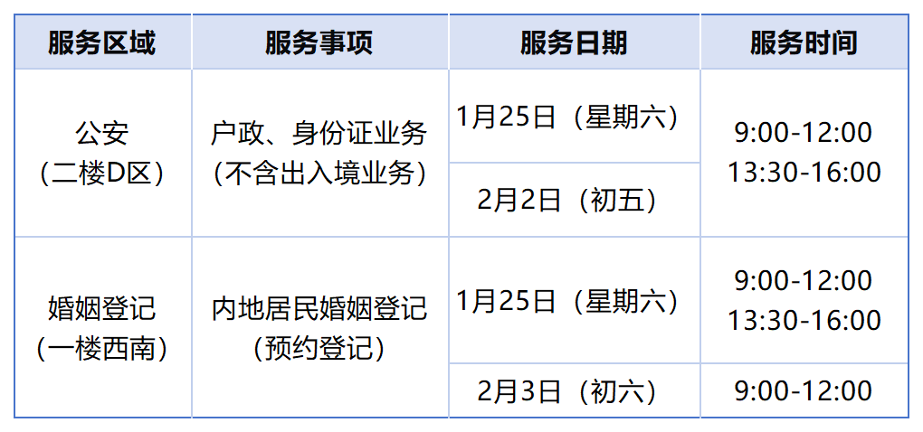 根据《国务院办公厅关于2025年部分节假日安排的通知》(国办发明电〔2024〕12号)精神,蔡甸区政务服务中心于2025年1月28日(星期二)至2025年2月4日(星期二)放假,共8天,2025年1月26日(星期天)、2月8日(星期六)正常上班。2025年1月25日(星期六)、2月2日(初五)公安户政窗口提供延时服务,1月25日(星期六)、2月3日(初六)婚姻登记窗口提供延时服务(详见附表)。
