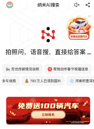 2、基于设备、位置、客户端版本等原因限制,部分用户无法参与本活动。包括:手机系统版本在Android 7.0或iOS 15及以下的用户、使用鸿蒙系统的手机及小程序的用户、纳米AI搜索客户端版本在2.0以下和Pad端的用户。