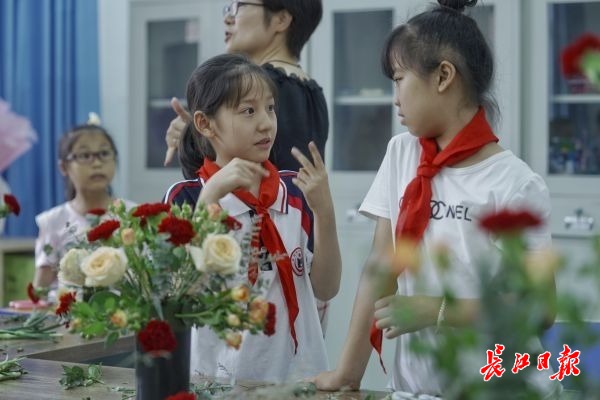 朱之怡和同学们一起学插花,她正用手语和同伴交流。记者肖僖摄