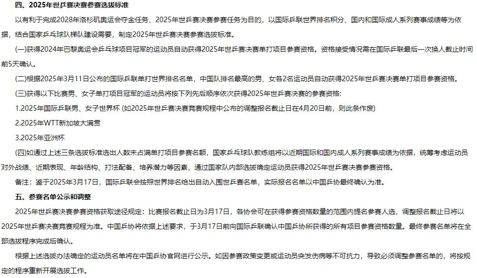 选拔标准第二条是讲根据世界排名获得单打资格。世界排名是2025年初大赛能力和成绩的重要参考依据,可以直观的反映运动员世乒赛前的真实状态。因此3月17日第一次报名前排名最高的前两名运动员将直接获得单打资格。