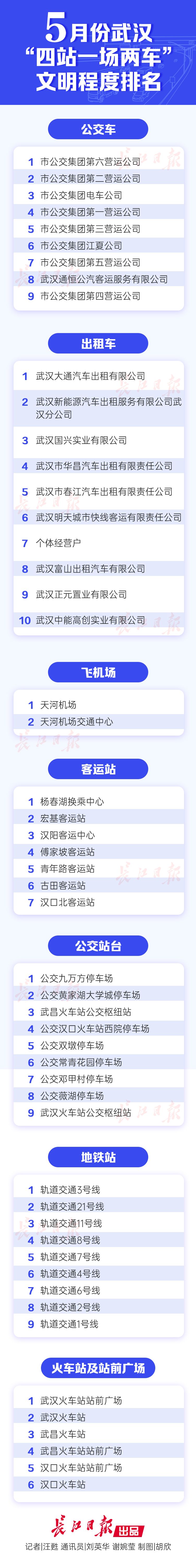 长江日报6月10日讯 6月10日,市文明办、市交通运输局首次公布5月份“四站一场两车”(火车站、客运站、地铁站、公交站台、飞机场和公交车、出租车)文明程度排名。各类场站综合排名第一的分别是天河机场、轨道交通3号线、武汉火车站站前广场、杨春湖换乘中心、市公交集团第六营运公司、武汉大通汽车出租有限公司、公交九万方停车场。
