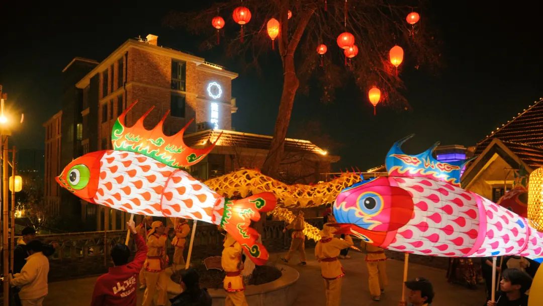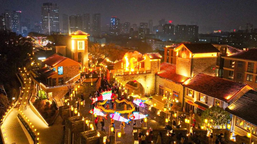 今起至初七,“一夜鱼龙舞”将在昙华林城墙游园会被具象化。熊熊烈火燃烧着,舞龙、舞鱼队伍耀眼夺目。在古城墙的映衬下,远处的黄鹤楼在发光,近处的鱼龙舞则摆出了一道年味浓浓的“大餐”。