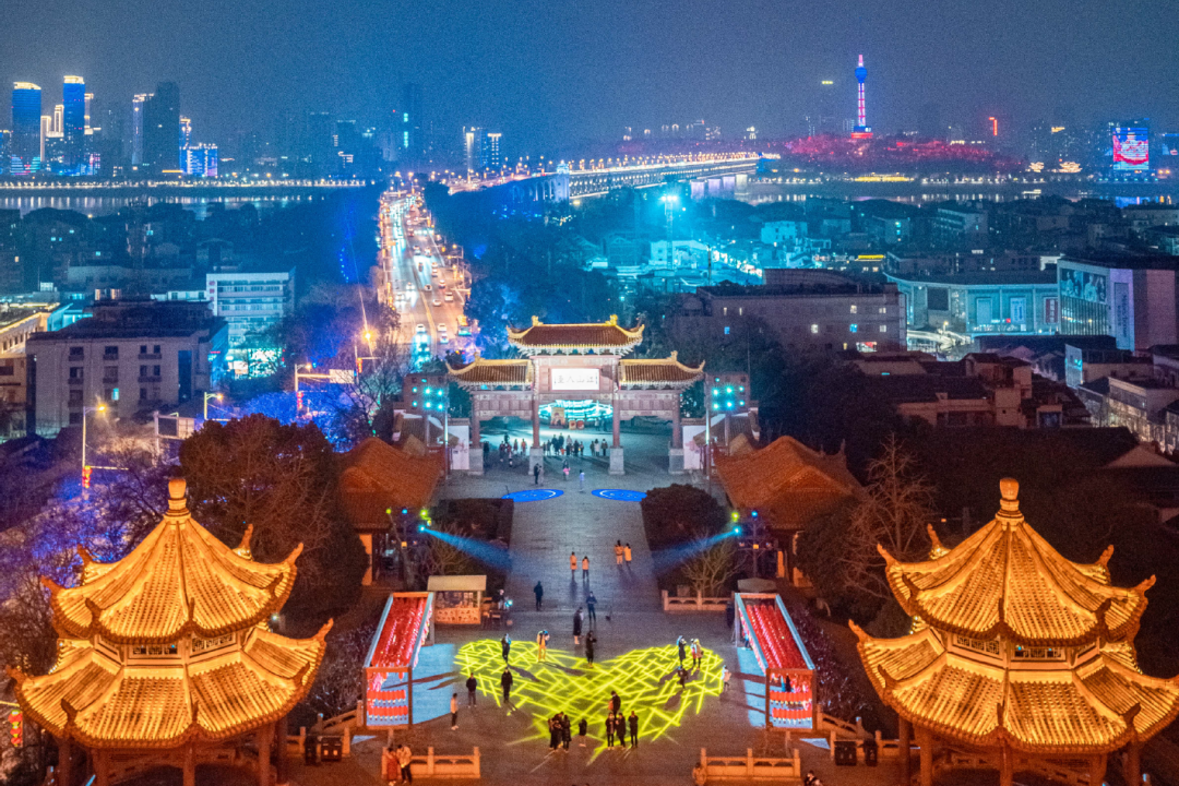 来武汉游武昌,一定要看看江城夜景。夜幕降临,两江四岸犹如一幅璀璨的画卷,长江灯光秀滚动播放“春节特辑节目”,将对每一位游客的新春祝福打在“公屏”上。
