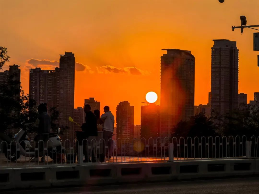 傍晚,武昌江滩开始进入高光时刻。长江上空,蓝天白云,江水之上,百舸争流。夕阳西下,晚霞绵延,鎏金晃荡,唯美极了。