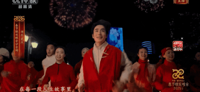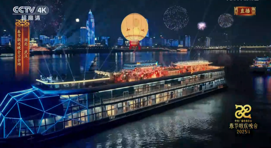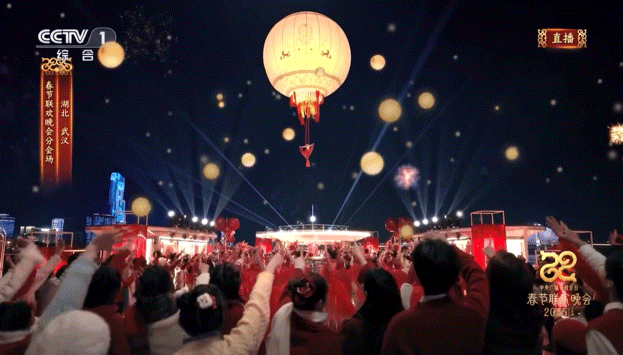 春晚里,武汉江面升起巨大的圆形氦气球,绸吊演员在气球之下舞动,画面唯美诗意。