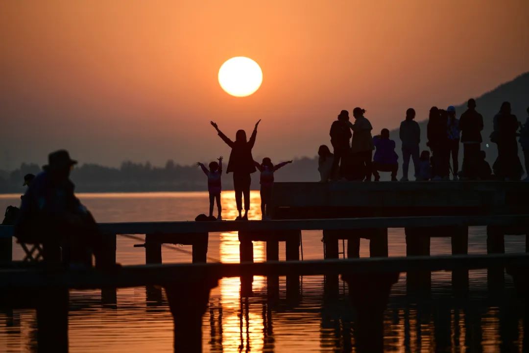 起早看日出,水天一线,光芒万丈,湖水荡漾,碎金晃荡起伏,一幅限时版的山水画卷跃动眼前,令人心旷神怡。