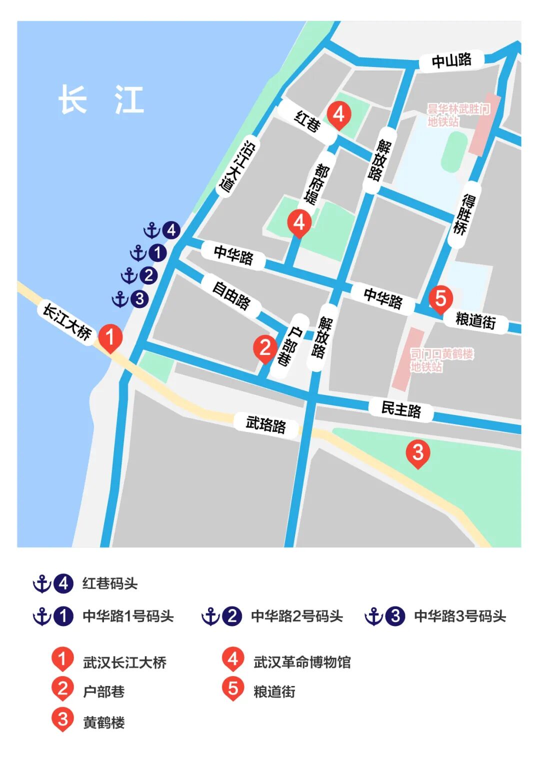凌波门—武汉大学—昙华林—粮道街—黄鹤楼公园—武汉长江大桥—武昌江滩—长江灯光秀(长江游船)