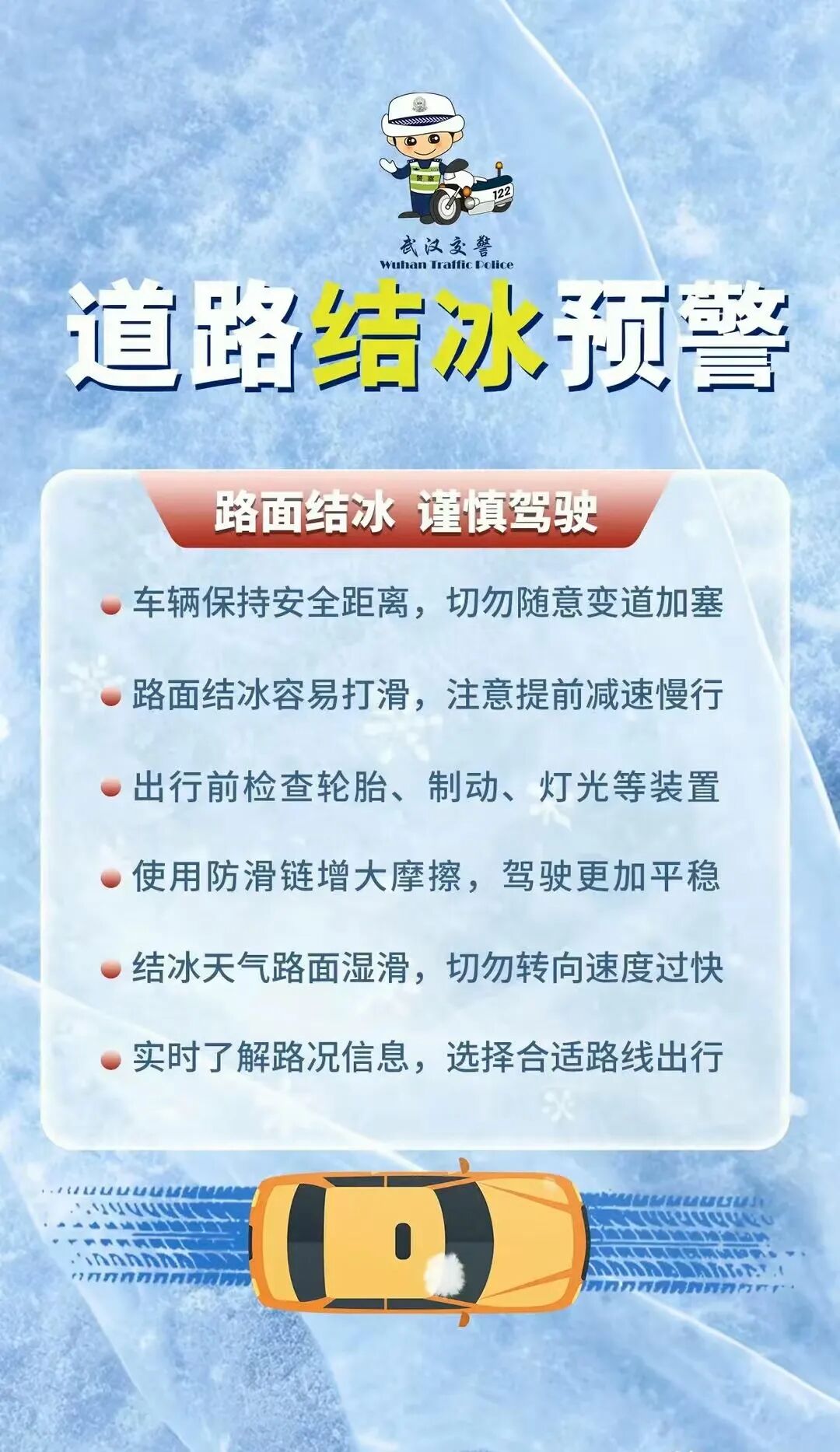 ●三环线盘龙立交、三金潭立交、黄孝河路桥、岱山桥、硚口的南泥湾高架桥面、汉阳的四新北路立交桥、青山的青化路(湖园路至北湖收费站)、洪山的卓刀泉中学上下高架等点位结冰多发。