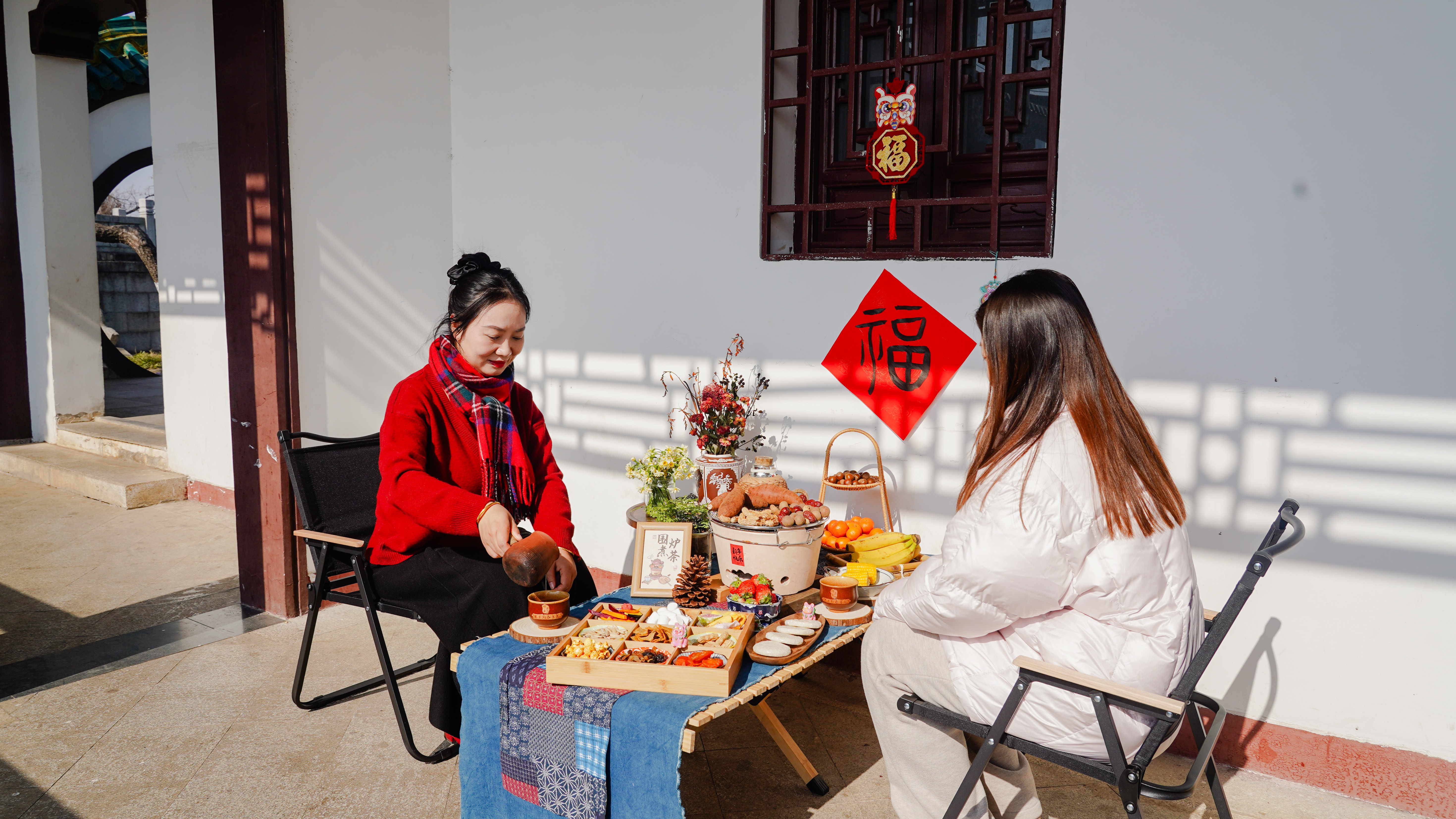 游客在龟山楚才韬奋书院内围炉煮茶。