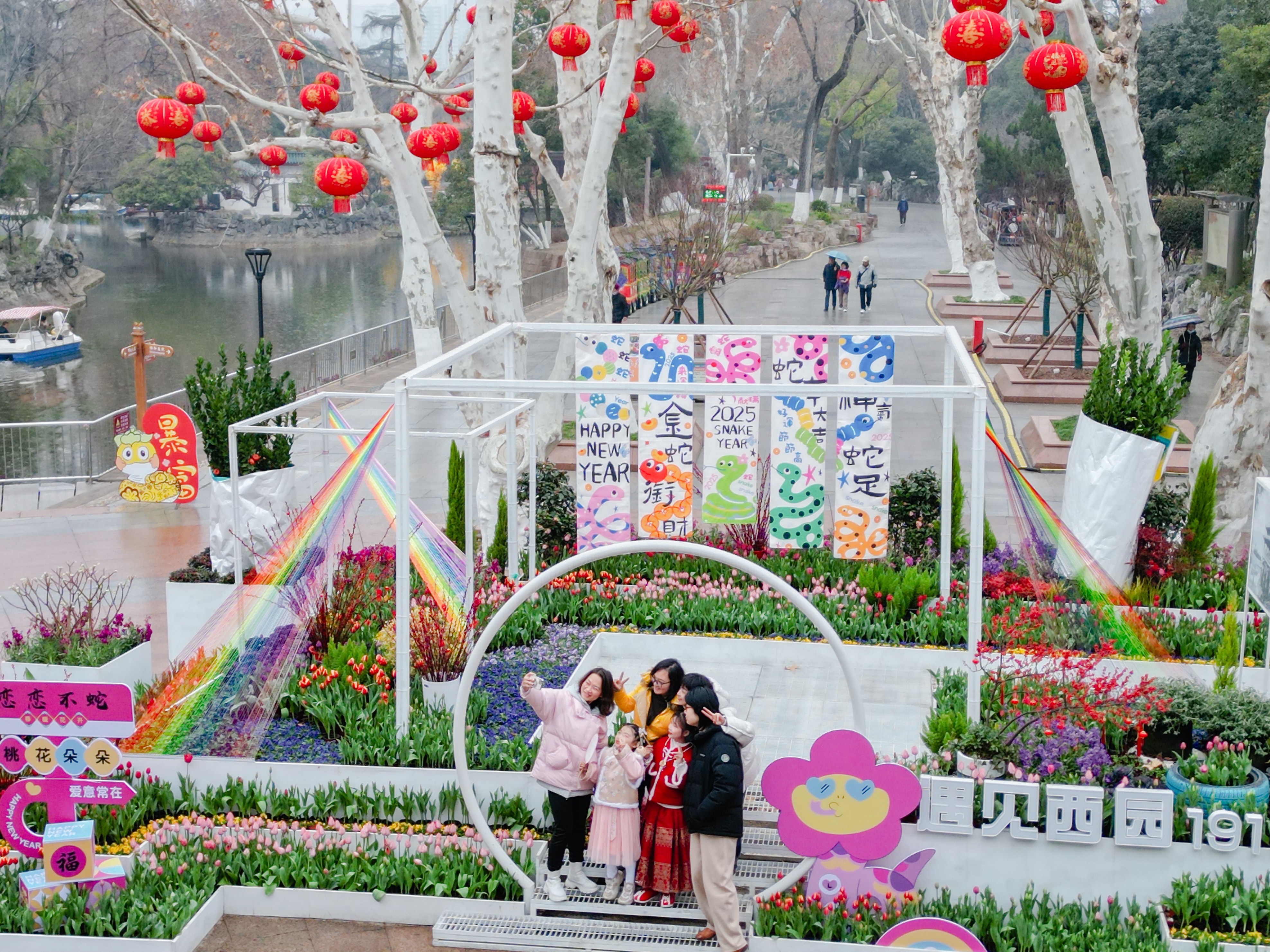 走进中山公园,“遇见西园”的郁金香打卡点,吸引着不少游客拍照。粉色、紫红、橘红色的郁金香和红梅树、茶梅、年宵花等时令花卉,在阳光的照耀下格外养眼,蛇年卡通形象的造型框架,更添新年氛围。