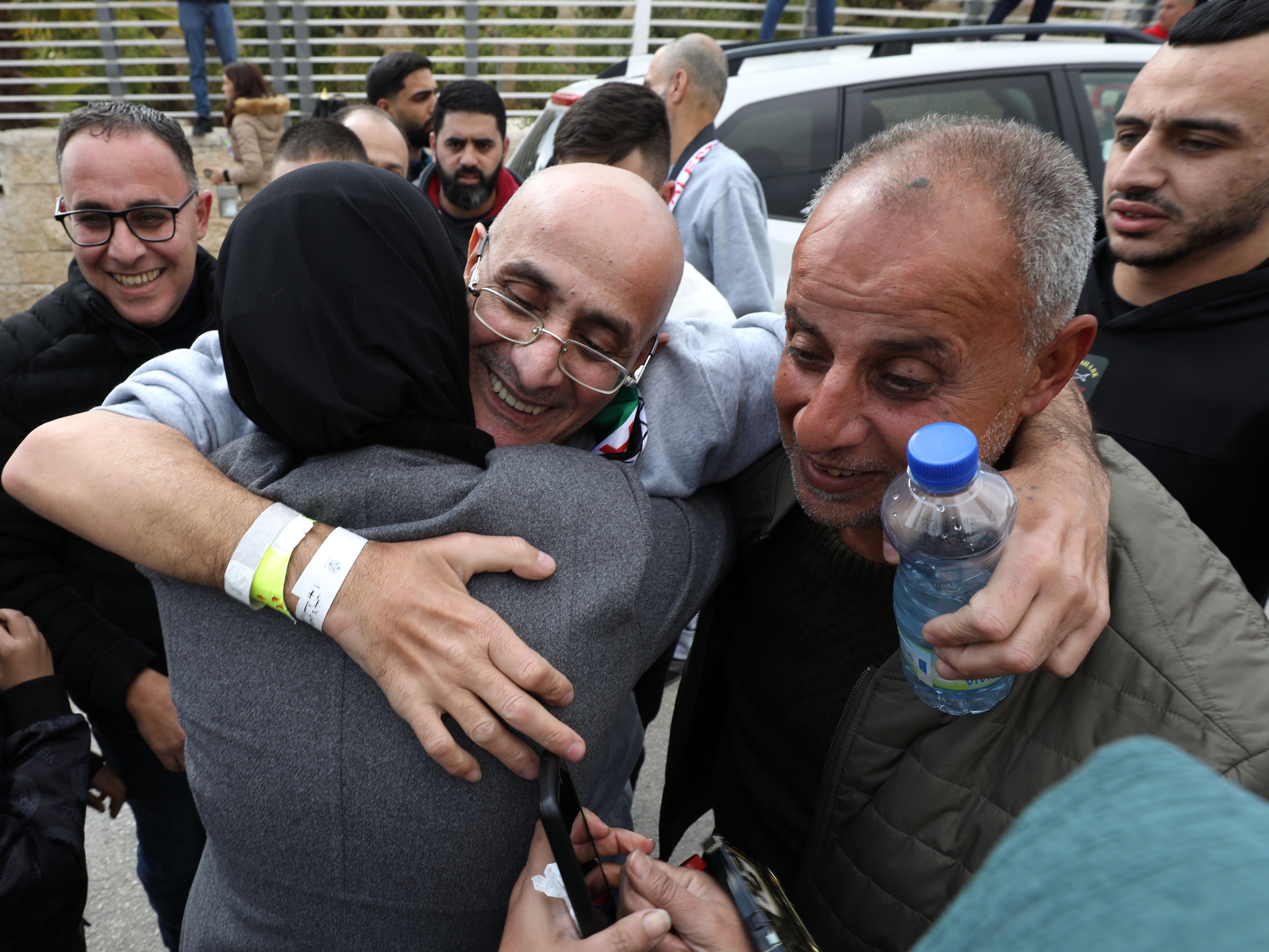 2月1日,在约旦河西岸城市拉姆安拉,人们拥抱获释的巴勒斯坦人。