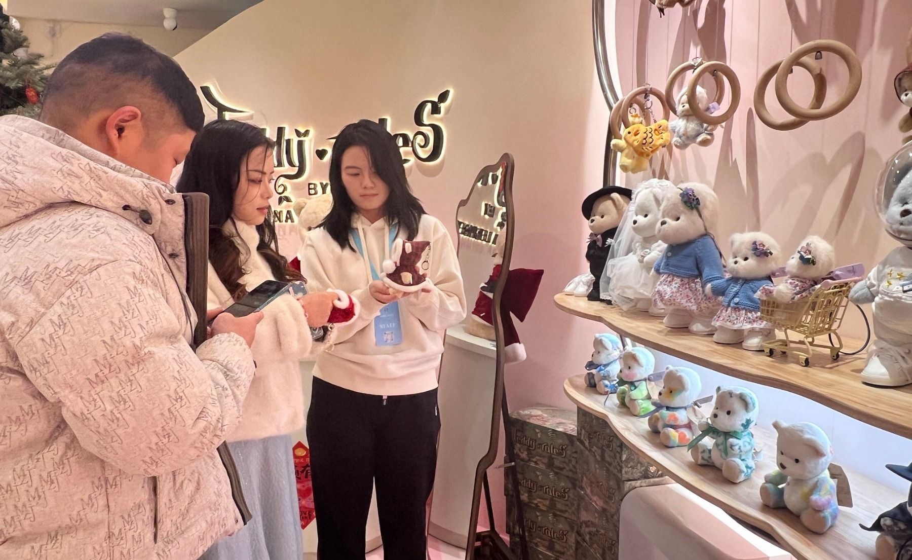 消费者听店员介绍小熊的故事。