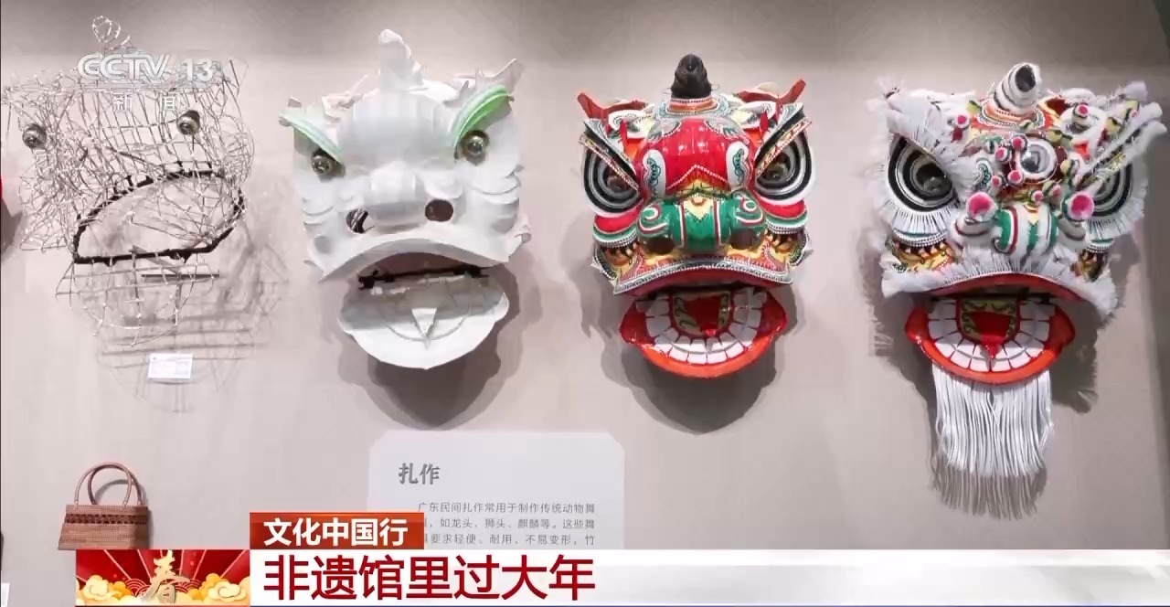 广东省非遗馆在春节期间推出多项非遗民俗体验活动,其中的彩扎体验观众在传承人的带领下感受醒狮的制作过程。来体验的游客跟着传承人学习如何描绘狮头纹样,最后一步是“装狮”涂上光亮油漆、配上兔毛绒球等装饰,狮头栩栩如生活灵活现。