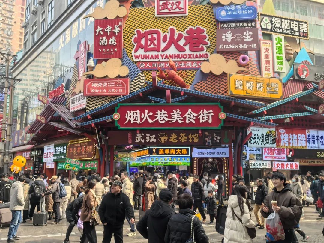 不少游客在江汉路的烟火巷美食街品尝美食。