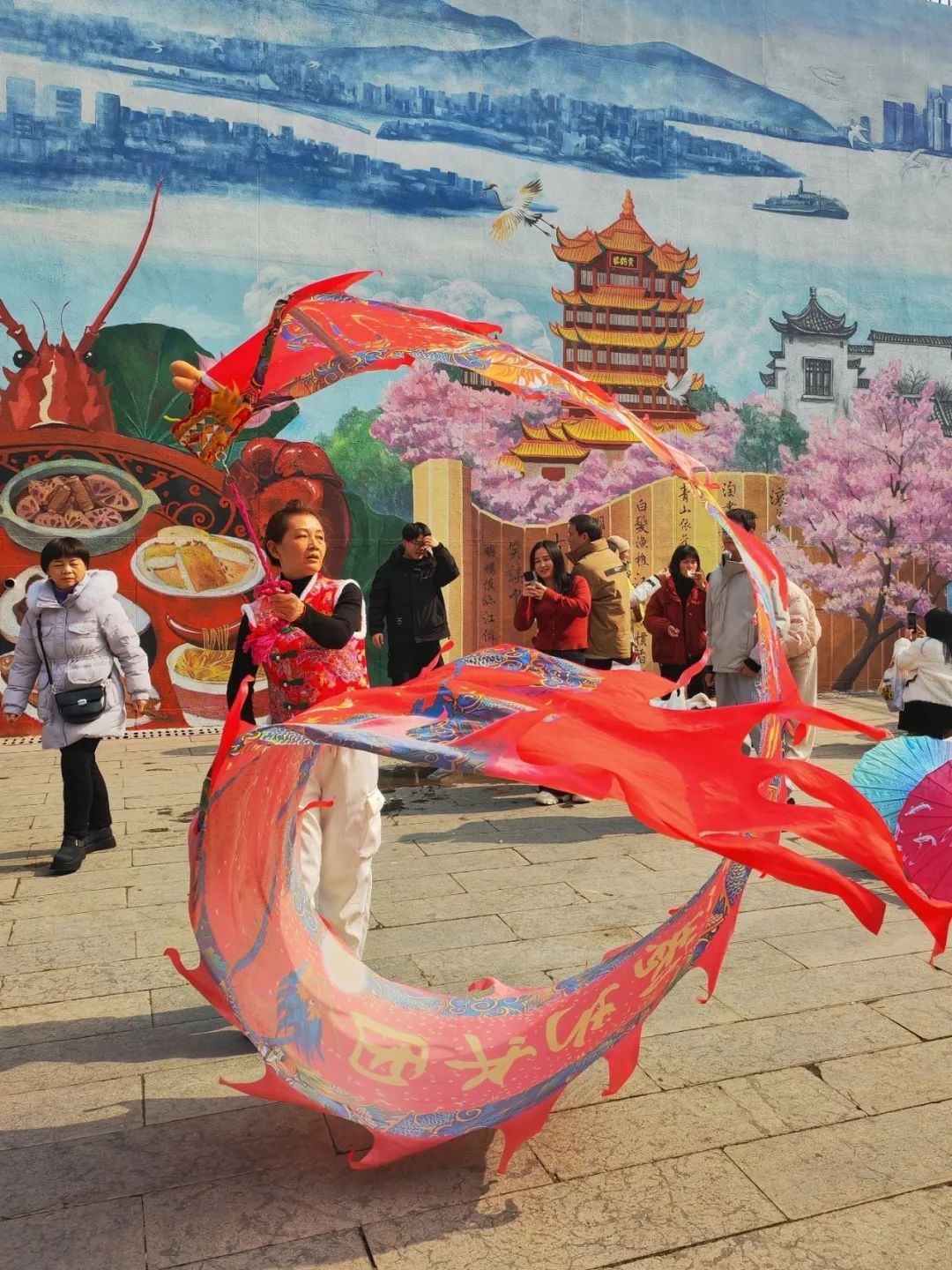大年初六,汉口里热闹非凡。墙画前人群簇拥,争相打卡。一位女士舞龙生风,龙身翻腾,引来众人围观。