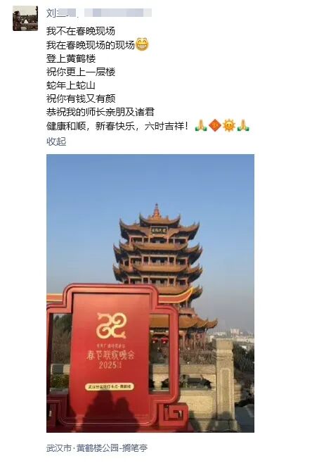 今年是蛇年,到黄鹤楼值班对我来说更添了一份特别的吸引力——那就是到春晚武汉分会场现场打卡!八点多,趁游客不多,我和同事小汪一起登上黄鹤楼,一睹春晚现场的风采。边爬楼梯,我边开玩笑地说:“登上黄鹤楼,更上一层楼;蛇年上蛇山,岁岁保平安。”西广场上,一片片LED屏如镜般倒映着天光云影、归鹤与亭台,宁静而祥和,与春晚现场的欢歌笑语、流光溢彩形成了鲜明的对比。千禧钟旁,一块红色的展示牌赫然在目,上面写着“2025乙巳年央视春节联欢晚会武汉分会场打卡点”。那一刻,我在朋友圈里自豪地写道:“我不在春晚现场,我在‘春晚现场’的现场!”
