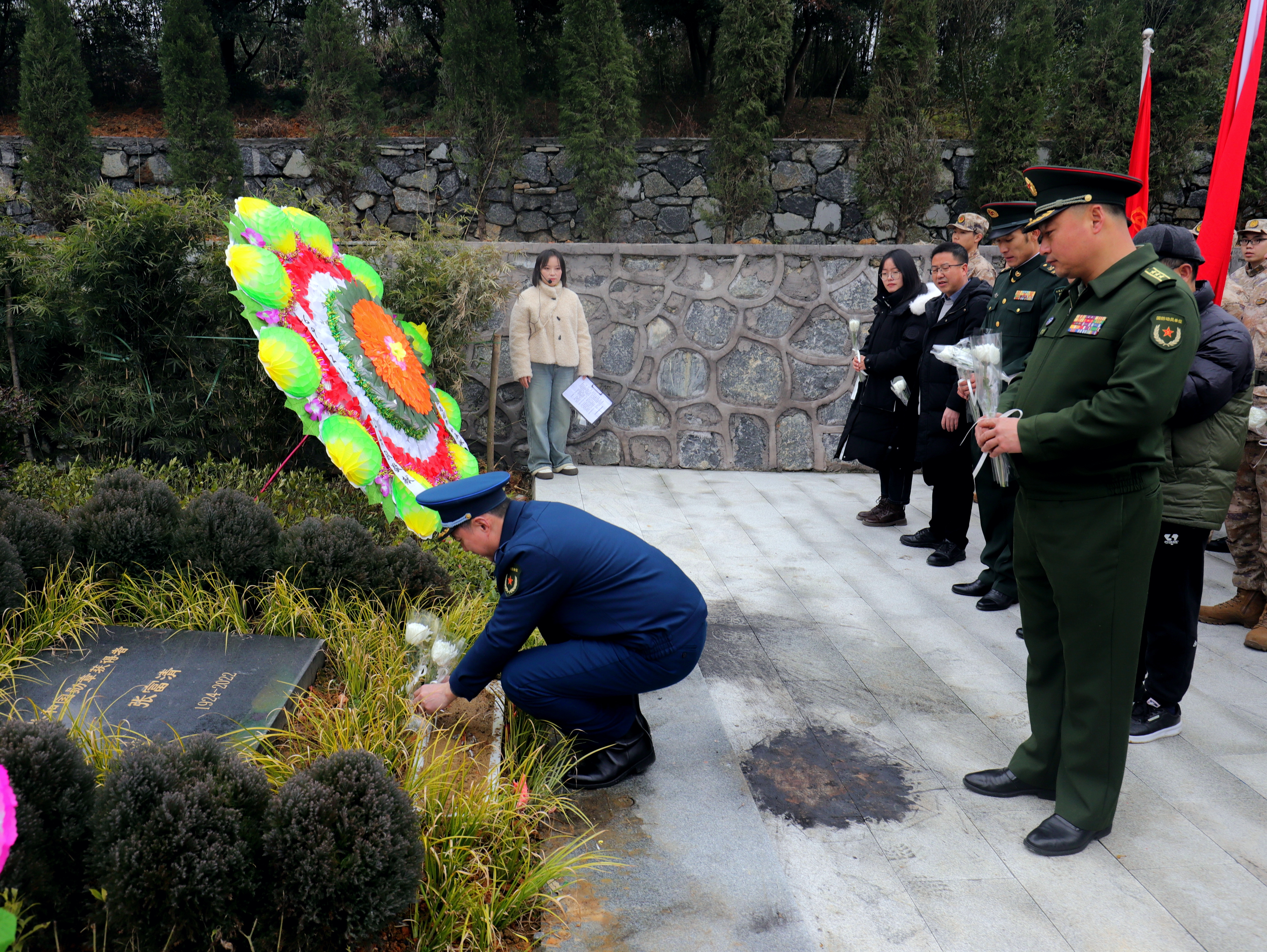 参加活动的人员把鲜花放在张富清老英雄墓前,深深鞠躬,肃立默哀,表达对老英雄的追思与敬意。