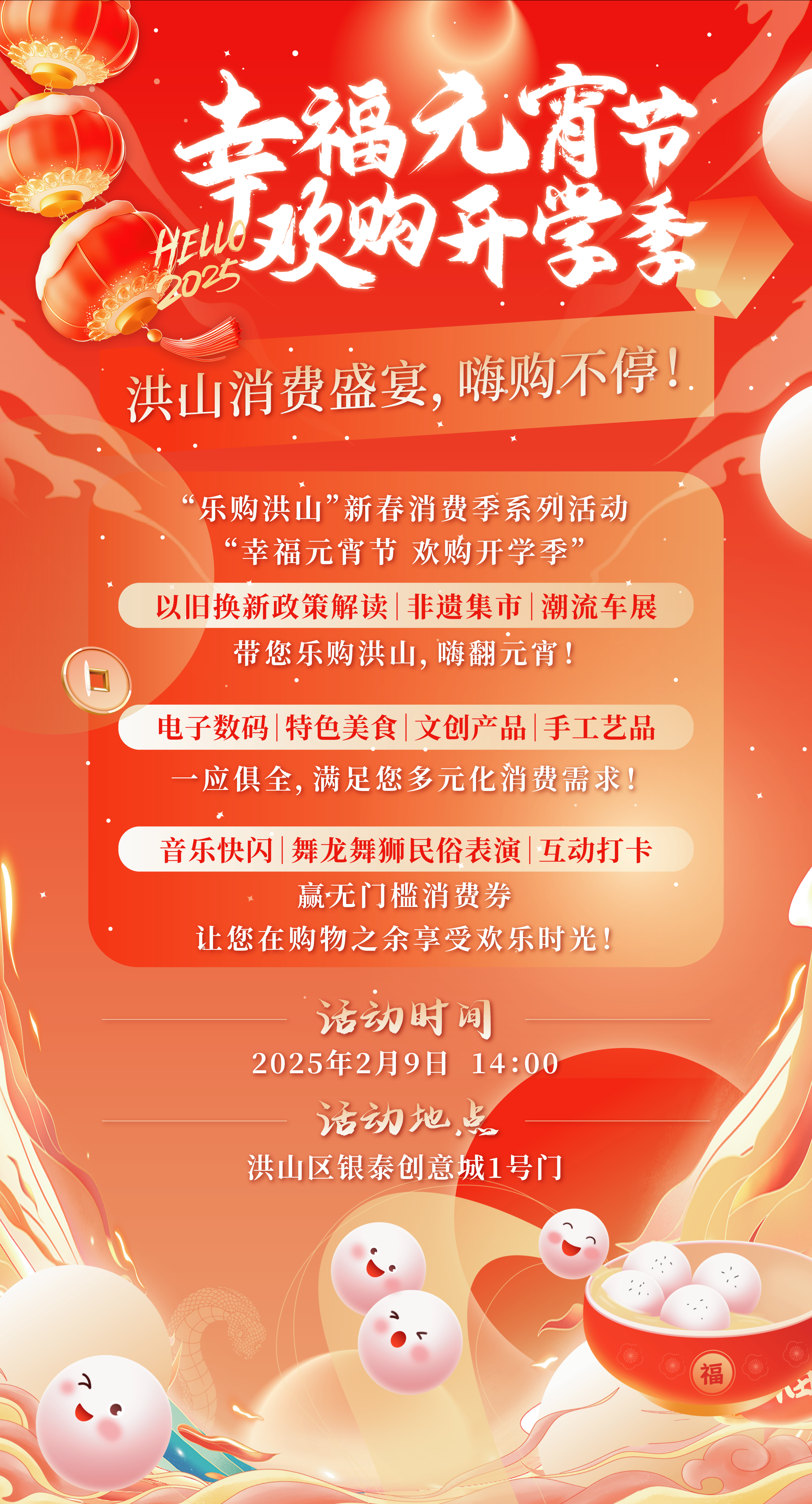 长江日报大武汉客户端2月8日讯(记者张晟 杨晓雨)元宵佳节临近、高校开学在即,作为消费主力军的大学生即将返汉,各大商圈又将有哪些精彩“好戏”上演?8日,长江日报记者从洪山区商务局获悉,洪山区将于明日下午2时在银泰创意城广场启动“乐购洪山”新春消费季系列活动之“幸福元宵节 欢购开学季”活动,当天洪山辖区各商圈、商贸企业将“官宣”元宵节与开学季期间开展的消费活动,现场还设有兼具文化和潮流的好物市集,等待市民前来解锁体验。