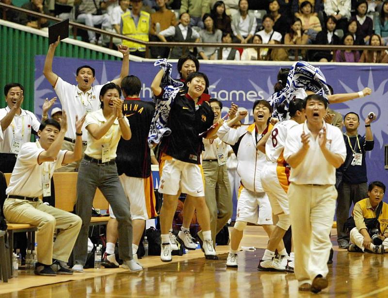 2002年10月14日,中国队以80:76战胜韩国队,夺得釜山亚运会女篮冠军。图为中国女篮教练员与队员在获胜后欢呼。新华社记者 李岳 摄
