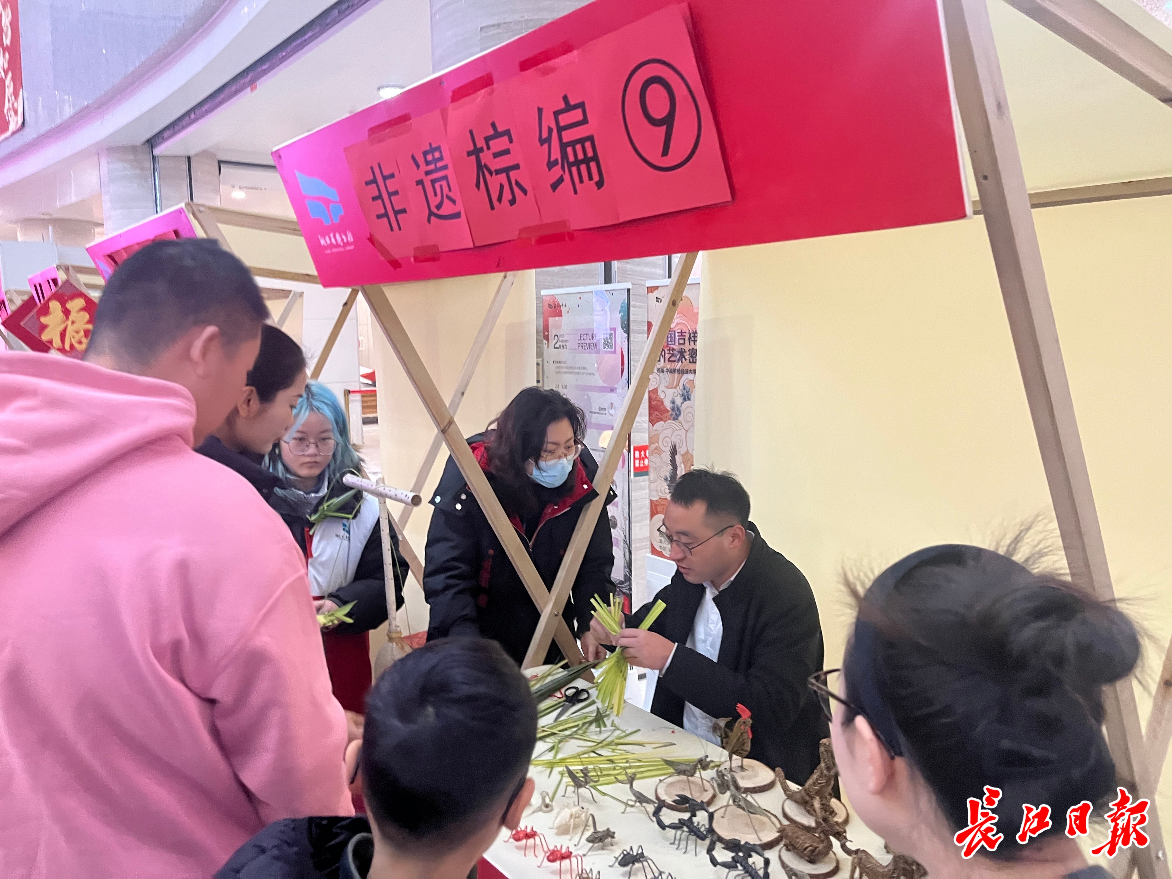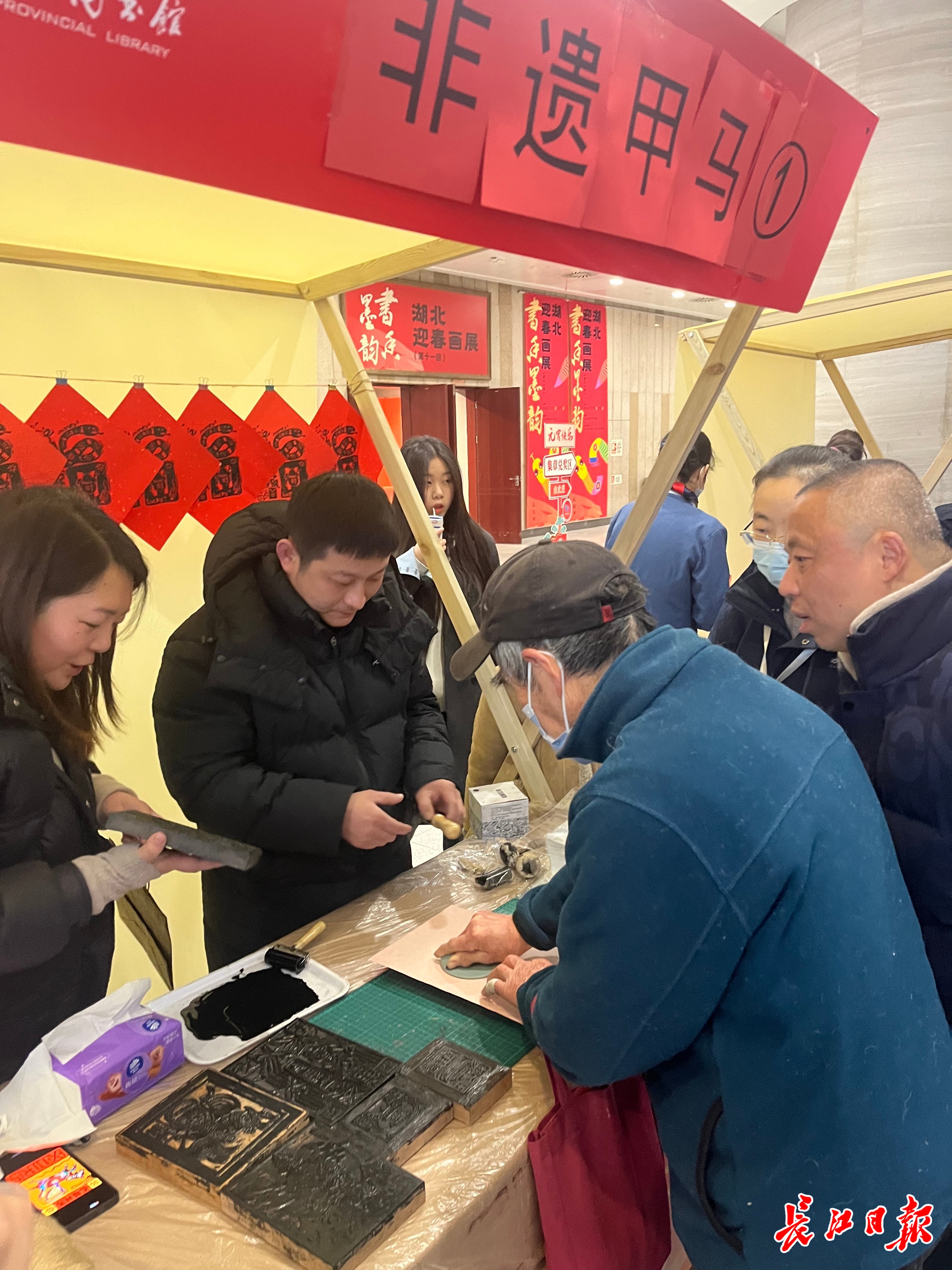 现场,棕编非遗传承人指尖翻飞,编就活灵活现的草编锦鲤,吸引了众多读者的围观。来自汉口的市民读者张先生带着儿子体验非遗项目“甲马拓印”。“甲马拓印起源于古代的祭祀文化。今天大家通过拓印祈愿新年吉祥。”他们一边听着馆员的介绍,一边将墨辊在梨木雕版上反复滚压,揭起宣纸瞬间,灵蛇盘踞的生肖图案跃然眼前。