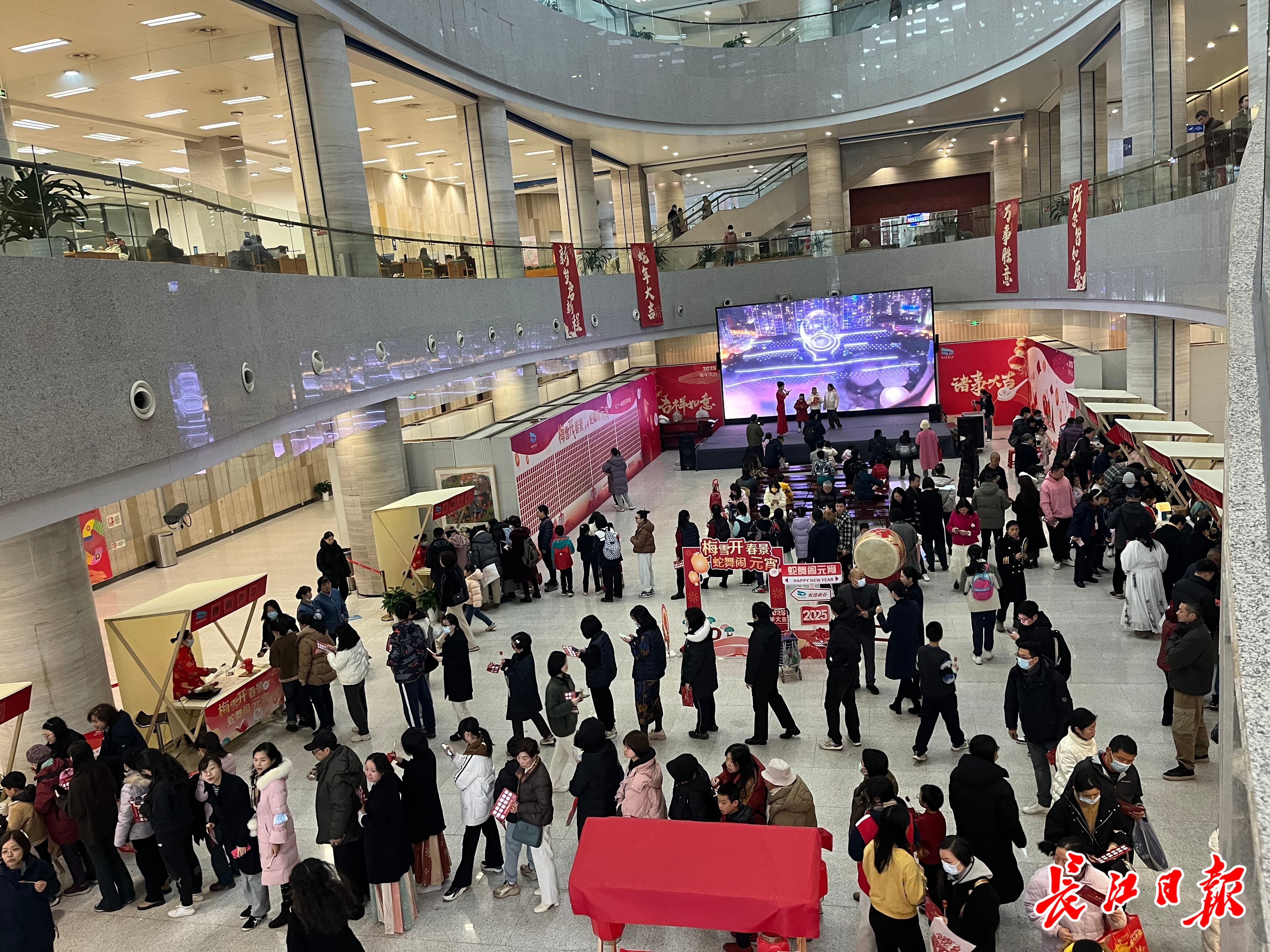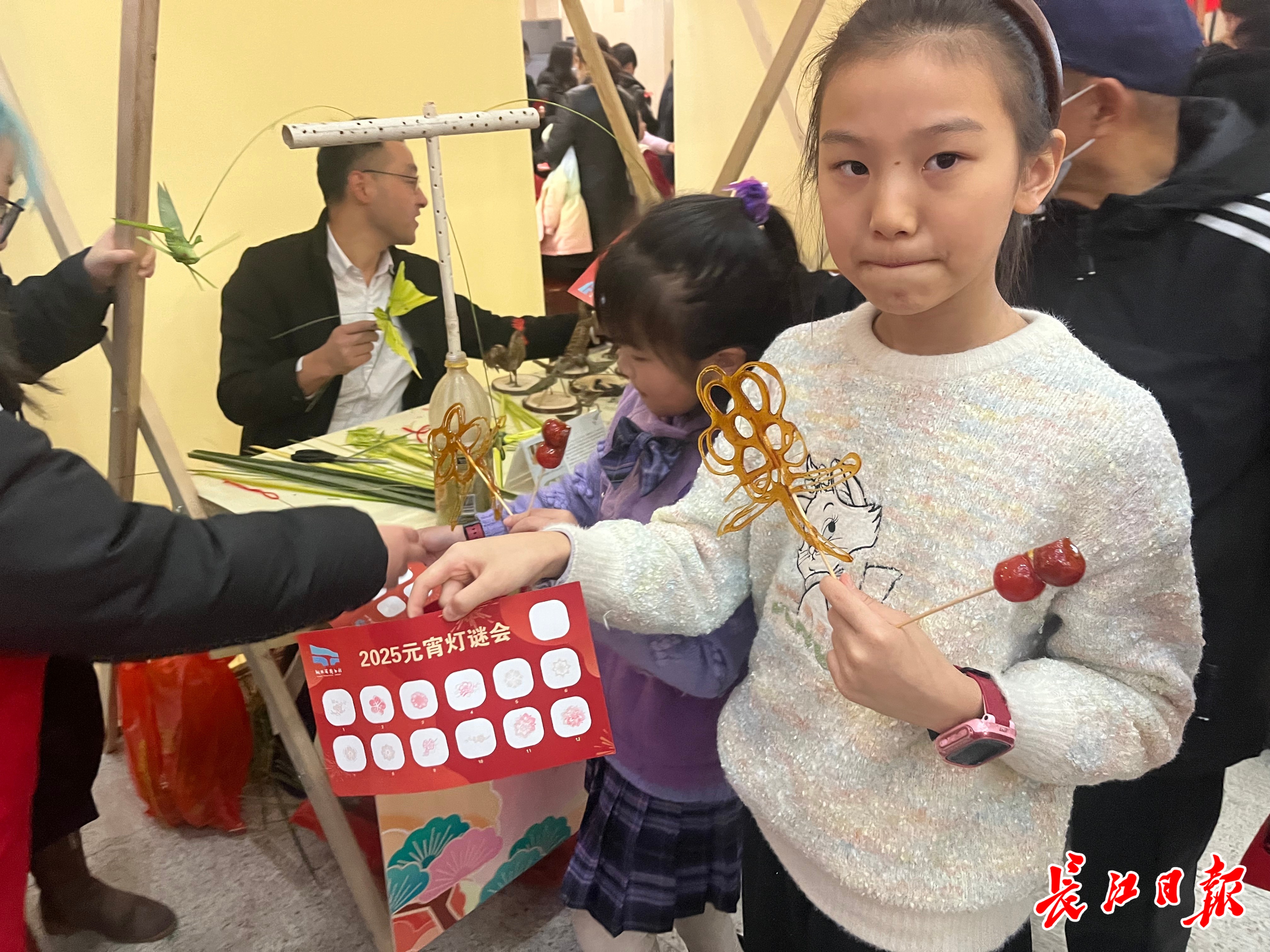 长江日报大武汉客户端2月12日讯 2月12日,正值蛇年元宵佳节,湖北省图书馆数百条灯谜营造出红红火火的节日氛围,甲马、棕编手作、投壶、糖画等非遗技艺吸引近千名市民读者观赏,不少读者动手参与非遗制作,体验了一把传统佳节里的传统文化韵味。